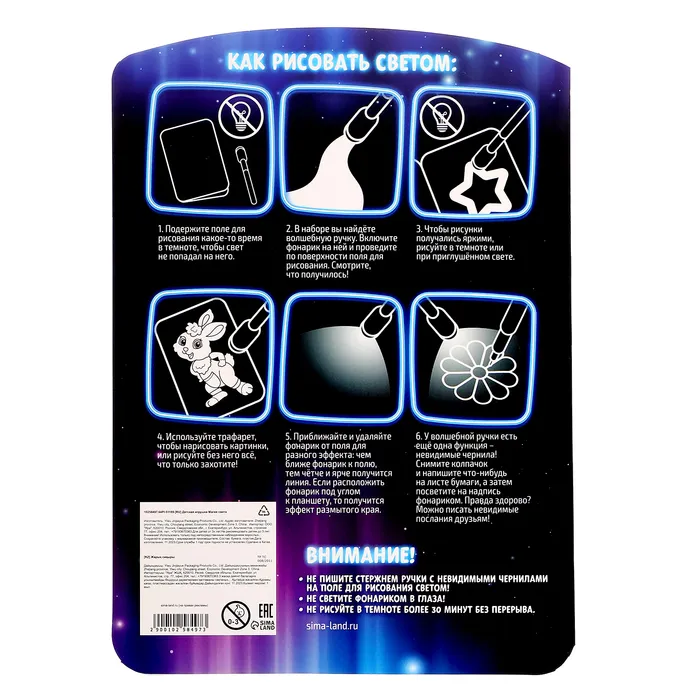 Всё, что пригодится для этого, уже есть в комплекте: поле для рисования, трафареты, специальная ручка и фонарик.