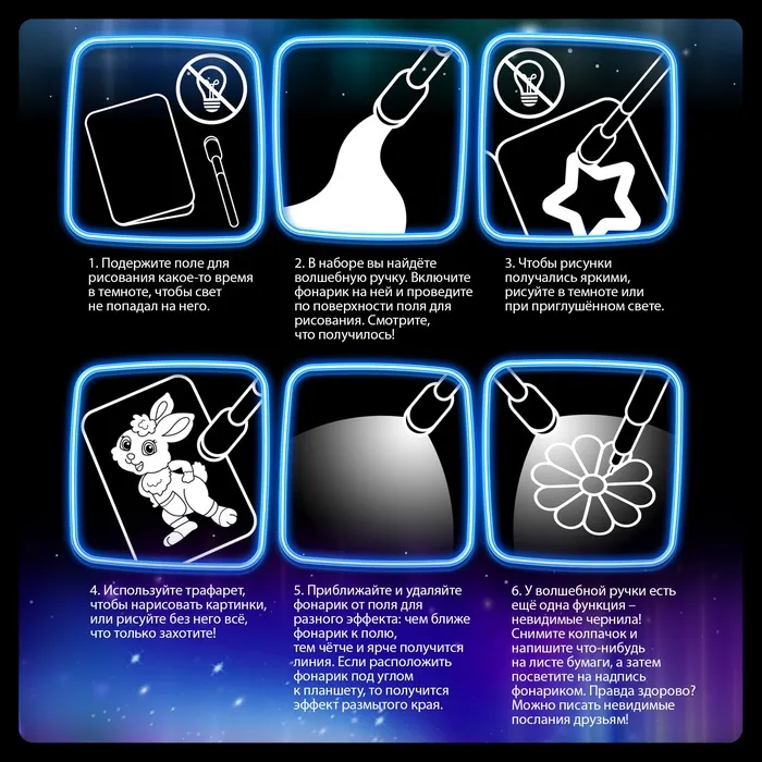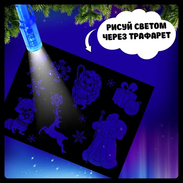 Рисование светом — увлекательное занятие, которое погружает в атмосферу волшебства. Новогодний набор для творчества станет отличным подарком для детей, ведь он объединяет искусство и магию. Создавайте сияющие узоры и праздничные картины, которые исчезают, чтобы можно было снова творить!