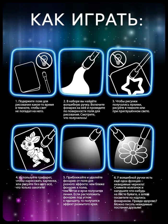 - Увлекательный процесс: светящиеся рисунки завораживают и мотивируют к дальнейшему творчеству.