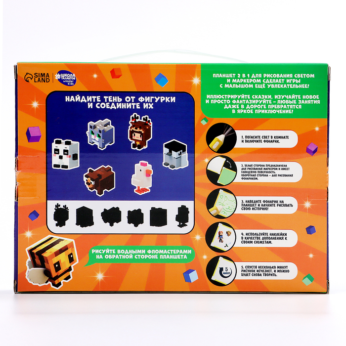 С помощью такой доски кроха сможет опробовать рисование светом. Для этого поместите планшет в тёмное место, удерживайте кнопку на маркере и ведите по поверхности. Ребёнок может использовать трафарет или придумать собственные сюжеты. Чем ближе вы держите маркер к планшету, тем ярче будет изображение.