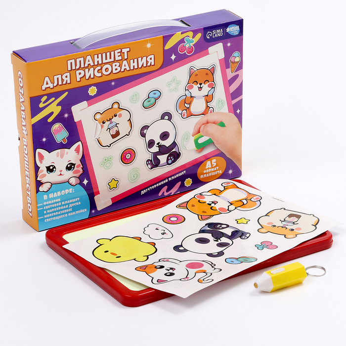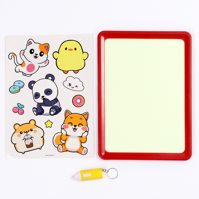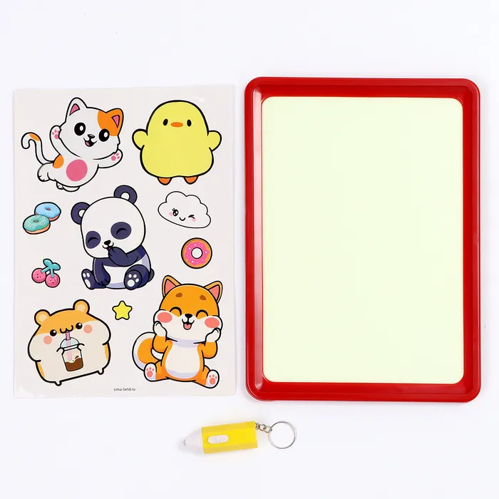 С помощью такой доски кроха сможет опробовать рисование светом. Для этого поместите планшет в тёмное место, удерживайте кнопку на маркере и ведите по поверхности. Ребёнок может использовать трафарет или придумать собственные сюжеты. Чем ближе вы держите маркер к планшету, тем ярче будет изображение.