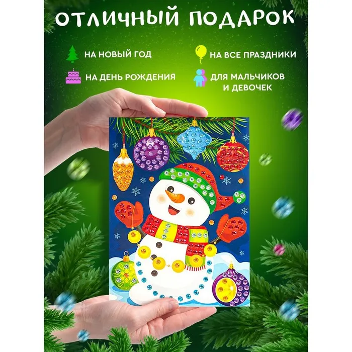 Рисунок из страз «Снеговик» — это чудесный творческий тренажёр для детей от 5 лет. Вы сможете вместе с ребёнком провести совместный досуг за картиной и создать яркий, забавный рисунок, которым потом можно будет украсить интерьер детской спальни. Стразы прикрепляются на обозначенные цветом поля, благодаря чему ребёнок тренирует внимание, мелкую моторику, а так же счёт и усидчивость.