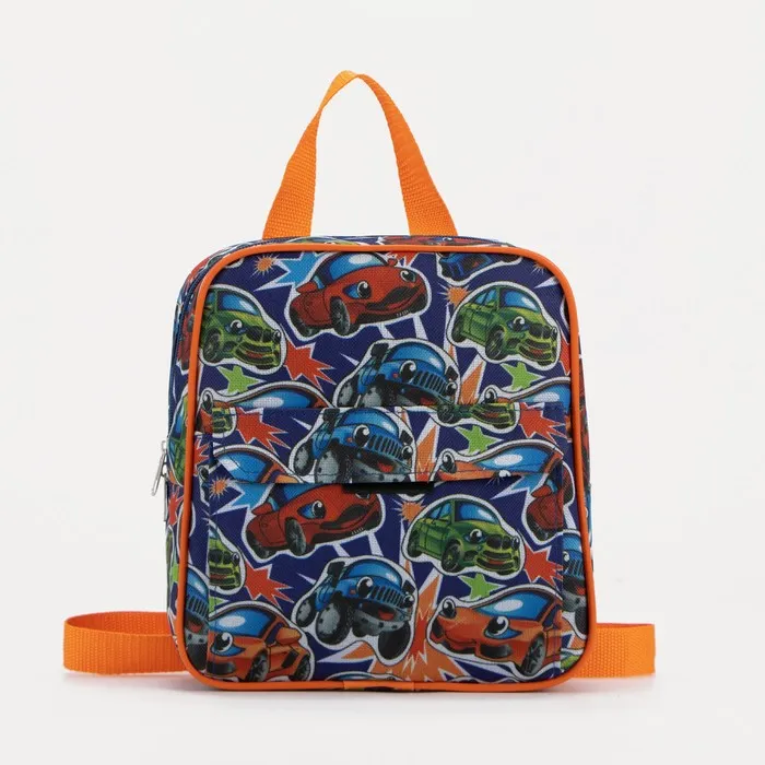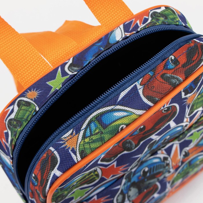 Стильный сине-оранжевый рюкзак с принтом создан для маленьких непосед. Яркий дизайн с машинками и самолётами сразу привлечёт внимание мальчика, а удобная конструкция позаботится о комфорте в детском саду.