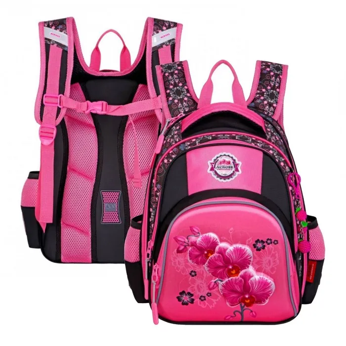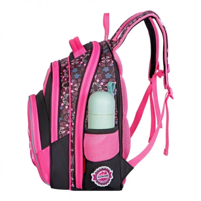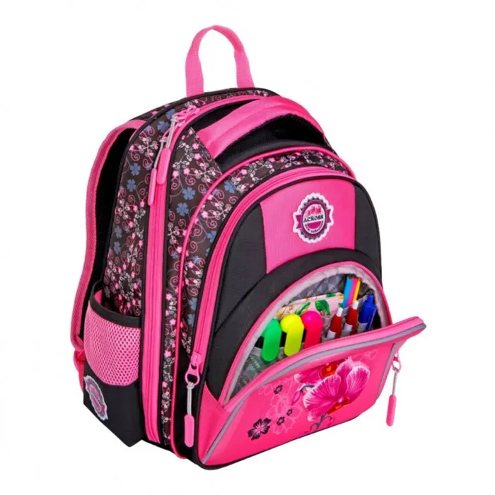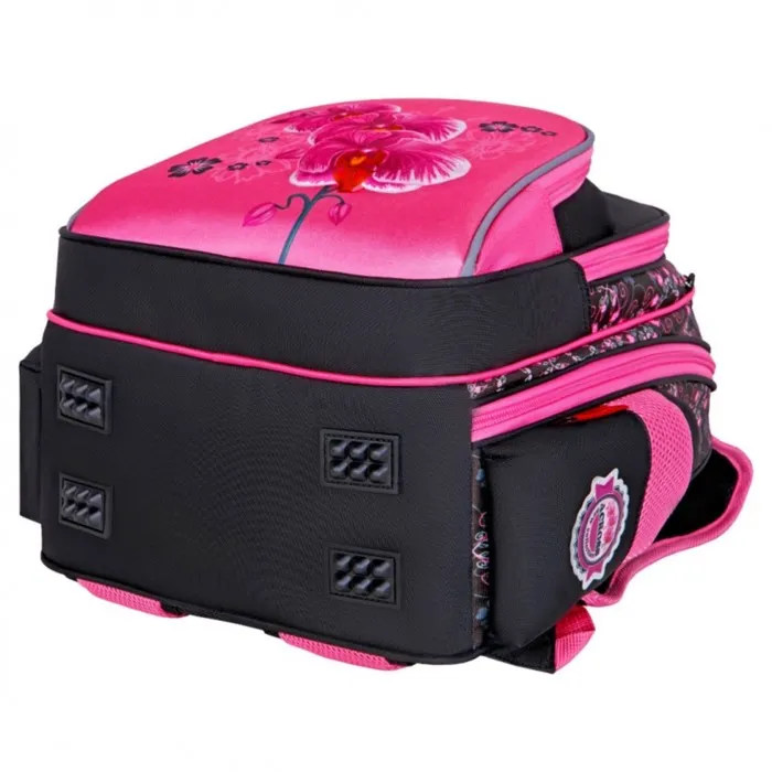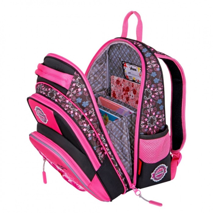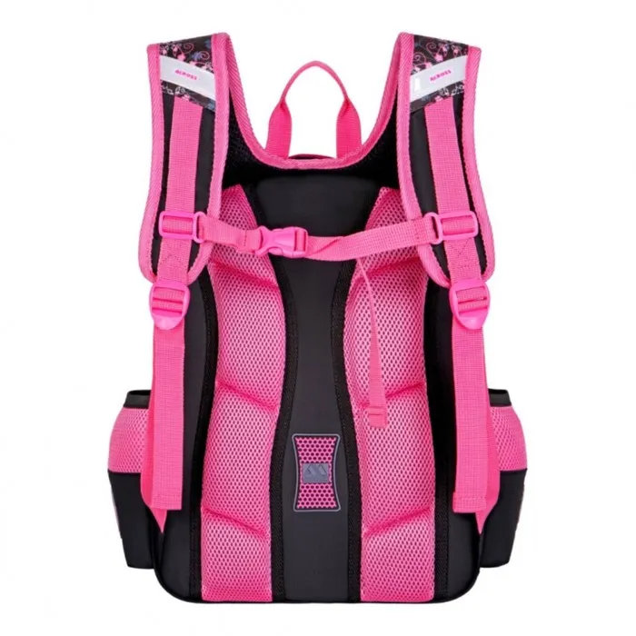 Рельефная ортопедическая спинка с каналами для циркуляции воздуха и сетчатой мембраной. В основном, самом большом отделении расположены жесткие разделители в переднем отделении предусмотрен органайзер. Два боковых сетчатых кармана. Усиленная ручка обеспечивает надежную фиксацию в руке ребёнка, а также имеется дополнительная петля, чтобы повесить ранец на крючок. По всей поверхности рюкзака(со всех сторон) расположены светоотражающие элементы. Рюкзак выполнен из влагостойкого материала.