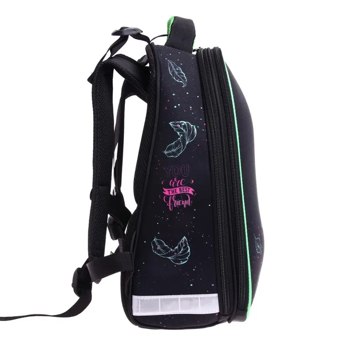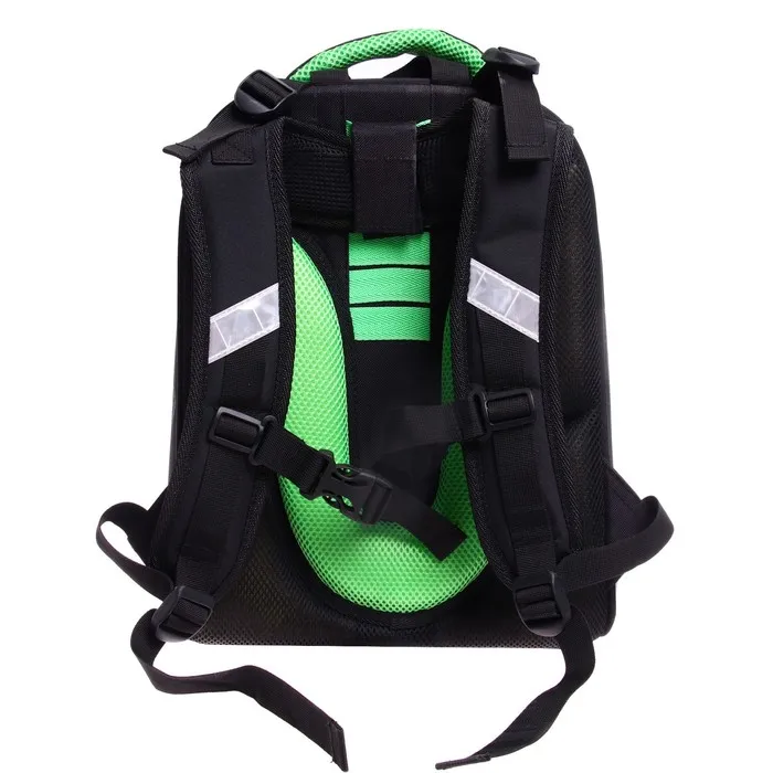 Ранец изготовлен из формованного EVA-материала и высокопрочного непромокаемого полиэстера. Размер 30 х 38 х 16 см. Вес 900 г. Прочные формованные стенки и дно ранца позволяют надежно защитить содержимое от влаги, загрязнений и предотвращают его замятие. Ранец с двумя вместительными отделениями, закрывающимися на реверсивную пластиковую молнию с металлическими «бегунками»; в первом — «плавающие» перегородки для тетрадей и учебников, во втором – большой карман из сетки и карманы-органайзеры для канцелярских принадлежностей. Плотная спинка с анатомическими элементами дополнительно укреплена пластиком, сверху – дышащая трехслойная сетка. Лямки-маечка плотные, мягкие. Регулируются по длине и высоте, что позволяет без труда отрегулировать их по росту ребенка. Ранец снабжен надежным нагрудным фиксатором. Есть удобная мягкая ручка для переноски и дополнительная петлевая ручка для размещения ранца на крюке. На дне ранца есть две пластиковые ножки. В соответствии с требованиями к безопасности на дороге, ранец имеет светоотражающие элементы на лямках и корпусе.