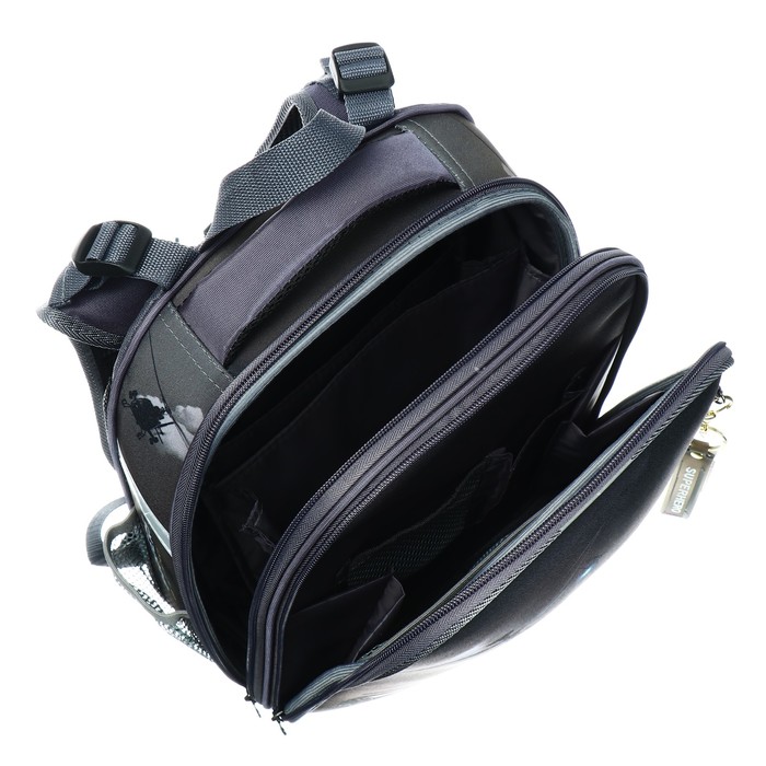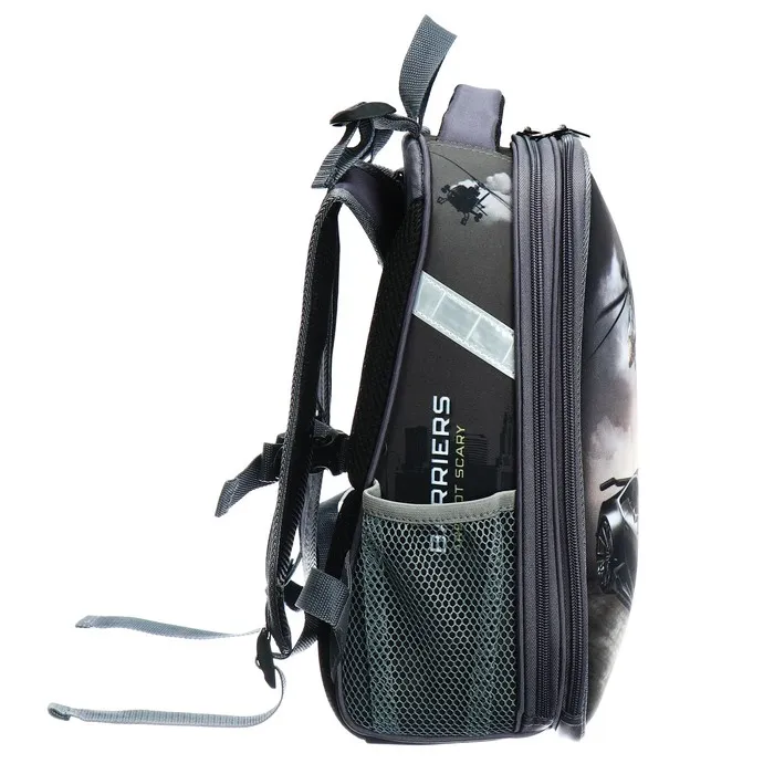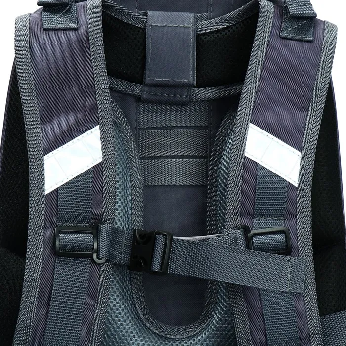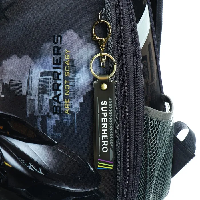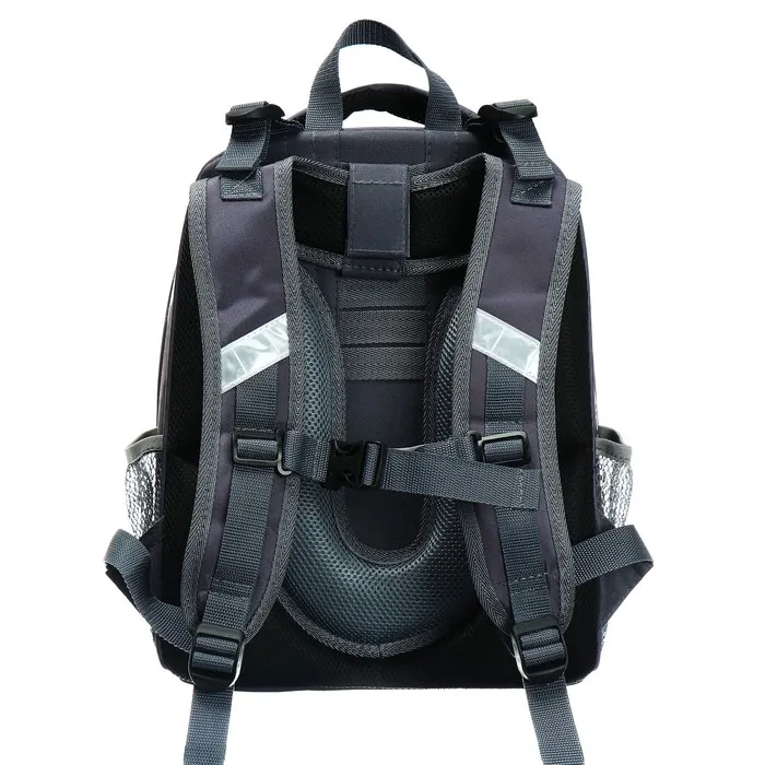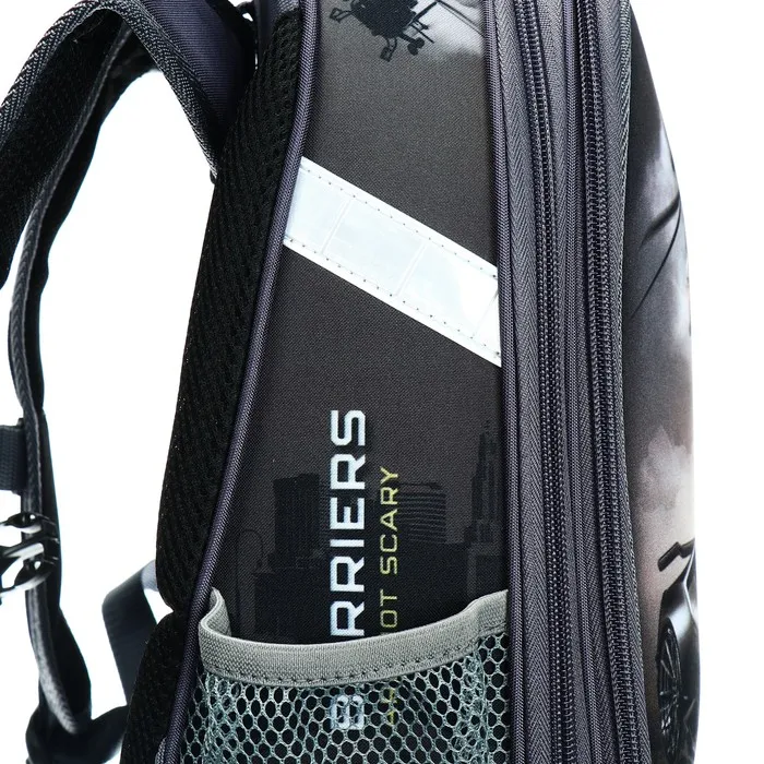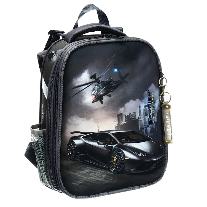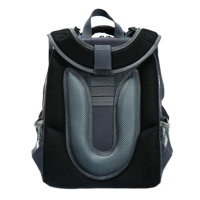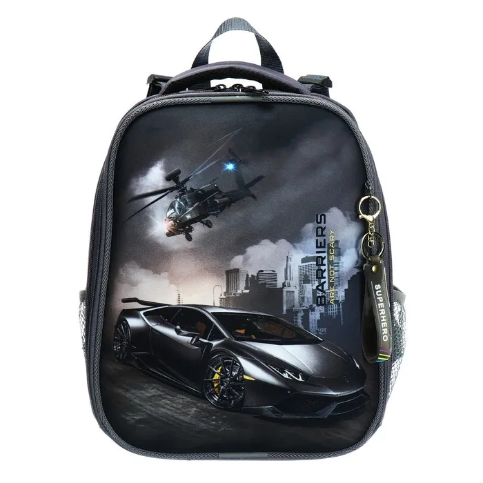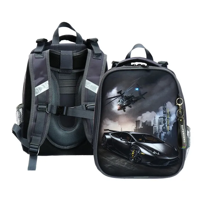 Ранец из формованного EVA-материала и высокопрочного непромокаемого полиэстера. Два вместительных отделения на реверсивной пластиковой молнии; в первом — «плавающие» перегородки для тетрадей и учебников, во втором – большой карман из сетки и карманы-органайзеры. Спинка с анатомическими элементами дополнительно укреплена пластиком, сверху – дышащая трехслойная сетка. Лямки-маечка плотные, мягкие. Регулируются по длине и высоте. Ранец снабжен нагрудным фиксатором и двумя боковыми карманами из прочной сетки. Есть мягкая ручка для переноски и дополнительная петлевая ручка для размещения ранца на крюке. На дне две пластиковые ножки. Ранец имеет светоотражающие элементы на лямках и корпусе. Брелок в комплекте.