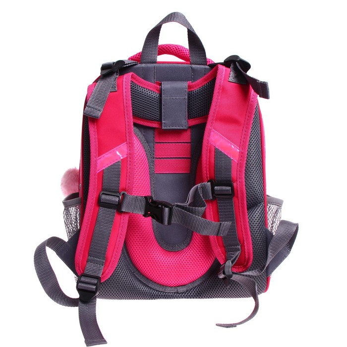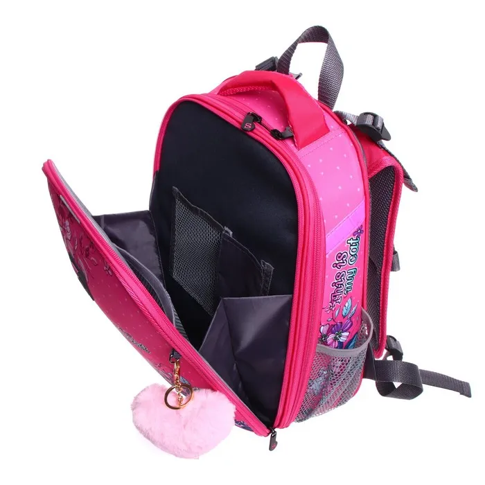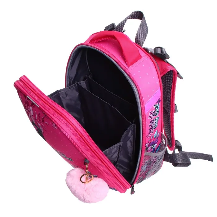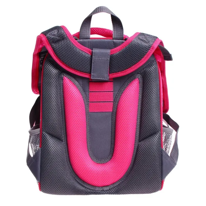 Ранец изготовлен из формованного EVA-материала и высокопрочного непромокаемого полиэстера. Размер 30 х 38 х 16 см. Вес 900 г. Прочные формованные стенки и дно ранца позволяют надежно защитить содержимое от влаги, загрязнений и предотвращают его замятие. Ранец с двумя вместительными отделениями, закрывающимися на реверсивную пластиковую молнию с металлическими «бегунками»; в первом — «плавающие» перегородки для тетрадей и учебников, во втором – большой карман из сетки и карманы-органайзеры для канцелярских принадлежностей. Плотная спинка с анатомическими элементами дополнительно укреплена пластиком, сверху – дышащая трехслойная сетка. Лямки-маечка плотные, мягкие. Регулируются по длине и высоте, что позволяет без труда отрегулировать их по росту ребенка. Ранец снабжен надежным нагрудным фиксатором. Есть удобная мягкая ручка для переноски и дополнительная петлевая ручка для размещения ранца на крюке. На дне ранца есть две пластиковые ножки. В соответствии с требованиями к безопасности на дороге, ранец имеет светоотражающие элементы на лямках и корпусе.