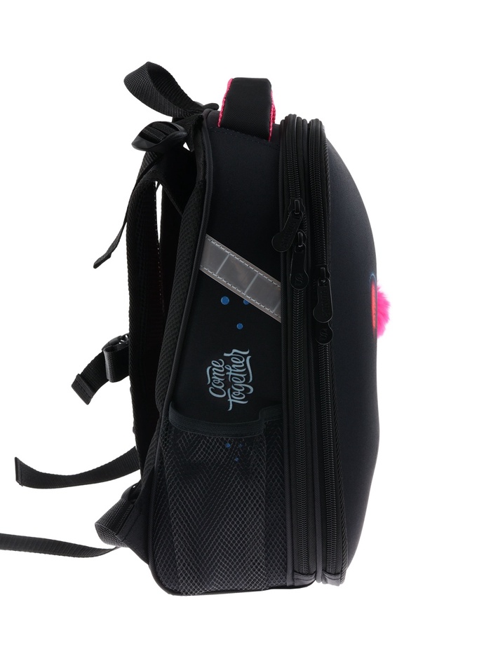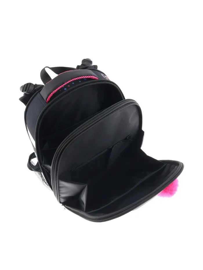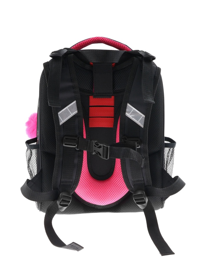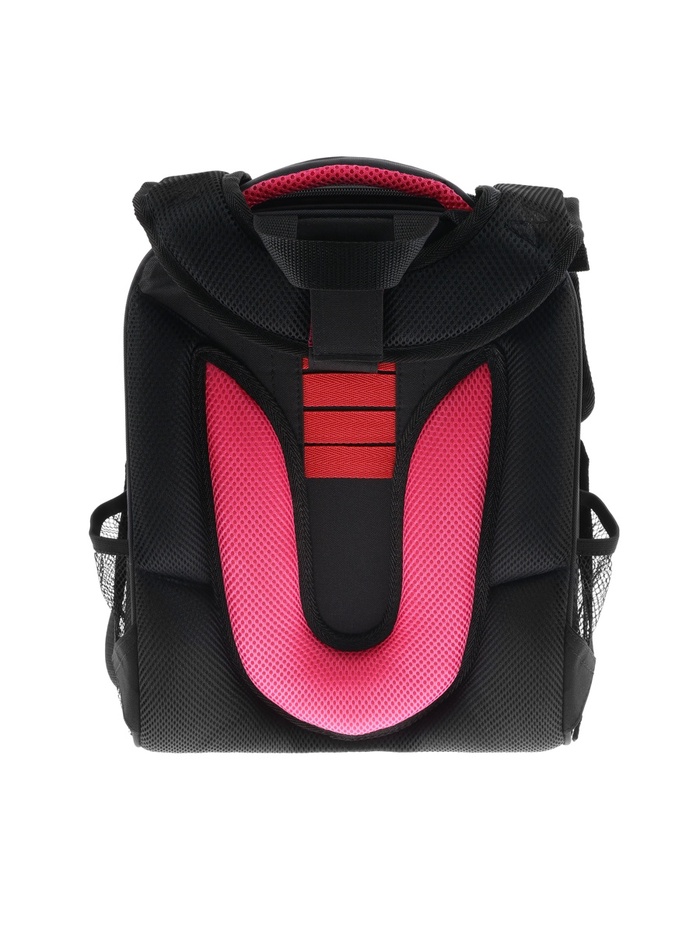 Плотная спинка с анатомическими элементами дополнительно укреплена пластиком, сверху – дышащая трехслойная сетка. Лямки-маечка плотные, мягкие. Регулируются по длине и высоте, что позволяет без труда отрегулировать их по росту ребенка. Ранец снабжен надежным нагрудным фиксатором и двумя боковыми карманами из прочной сетки. Есть удобная мягкая ручка для переноски и дополнительная петлевая ручка для размещения ранца на крюке