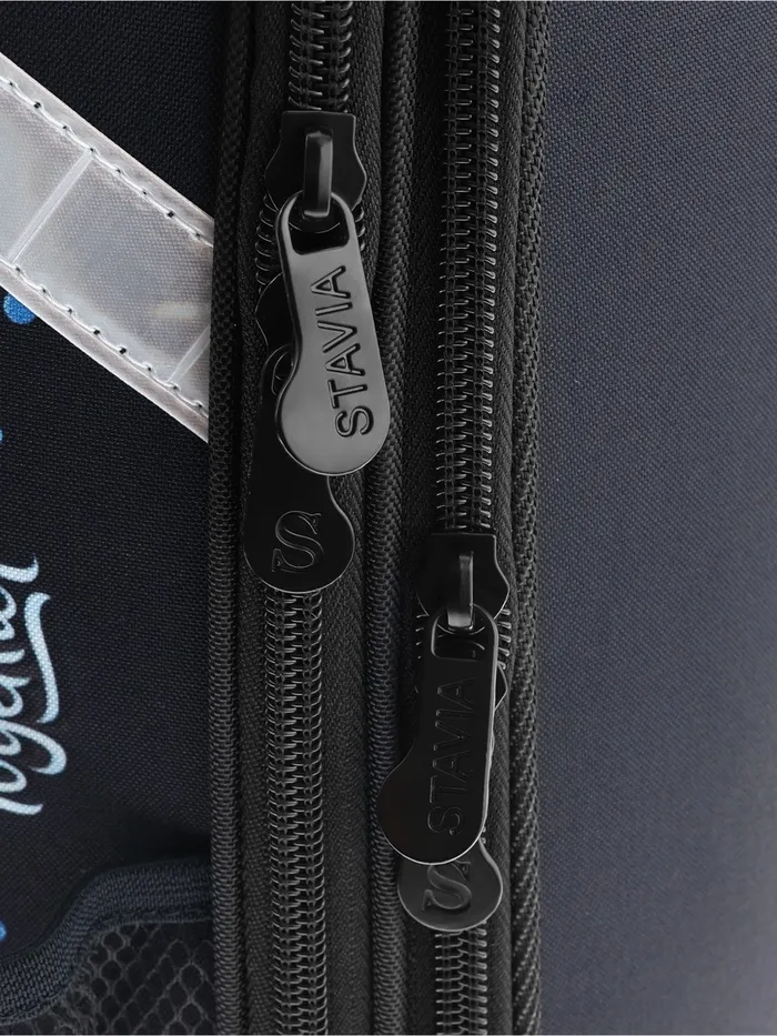 На дне ранца есть две пластиковые ножки. В соответствии с требованиями к безопасности на дороге, ранец имеет светоотражающие элементы на лямках и корпусе. Приятный бонус — колечко-подвес для брелока. Брелок также прилагается.