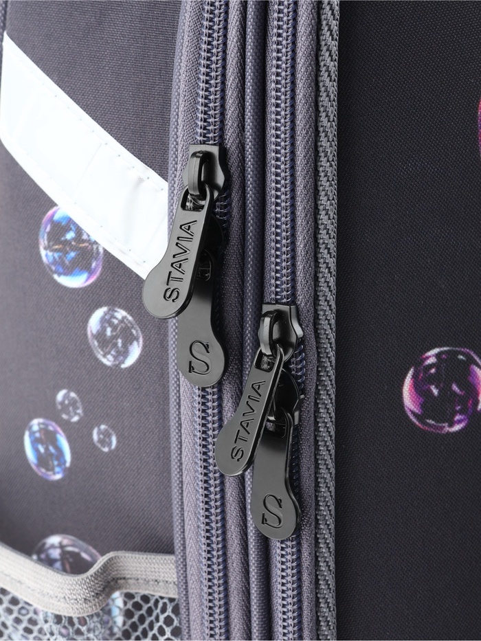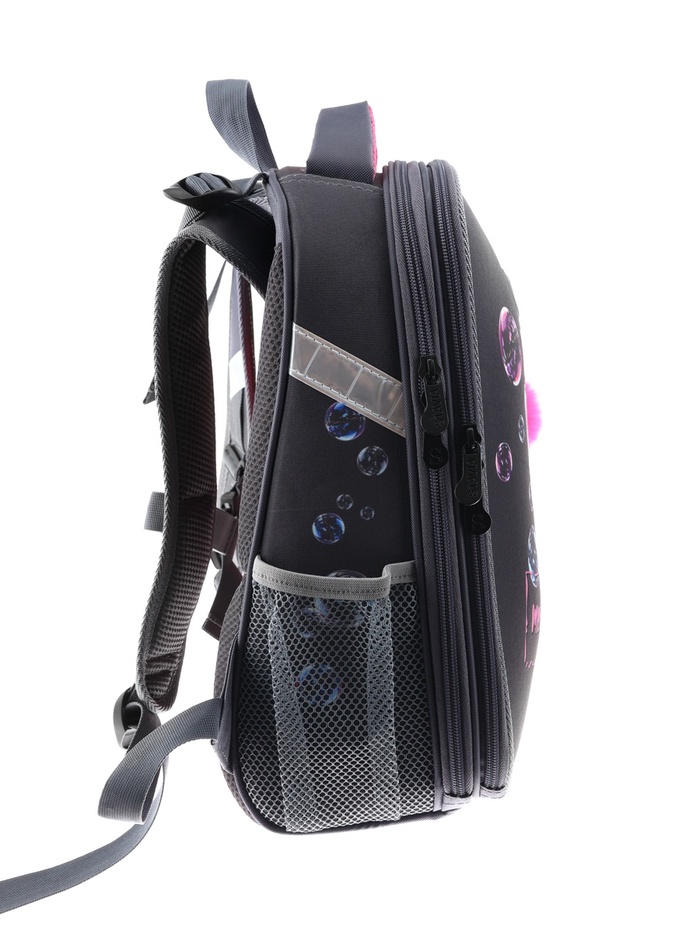 На дне ранца есть две пластиковые ножки. В соответствии с требованиями к безопасности на дороге, ранец имеет светоотражающие элементы на лямках и корпусе. Приятный бонус — колечко-подвес для брелока. Брелок также прилагается.
