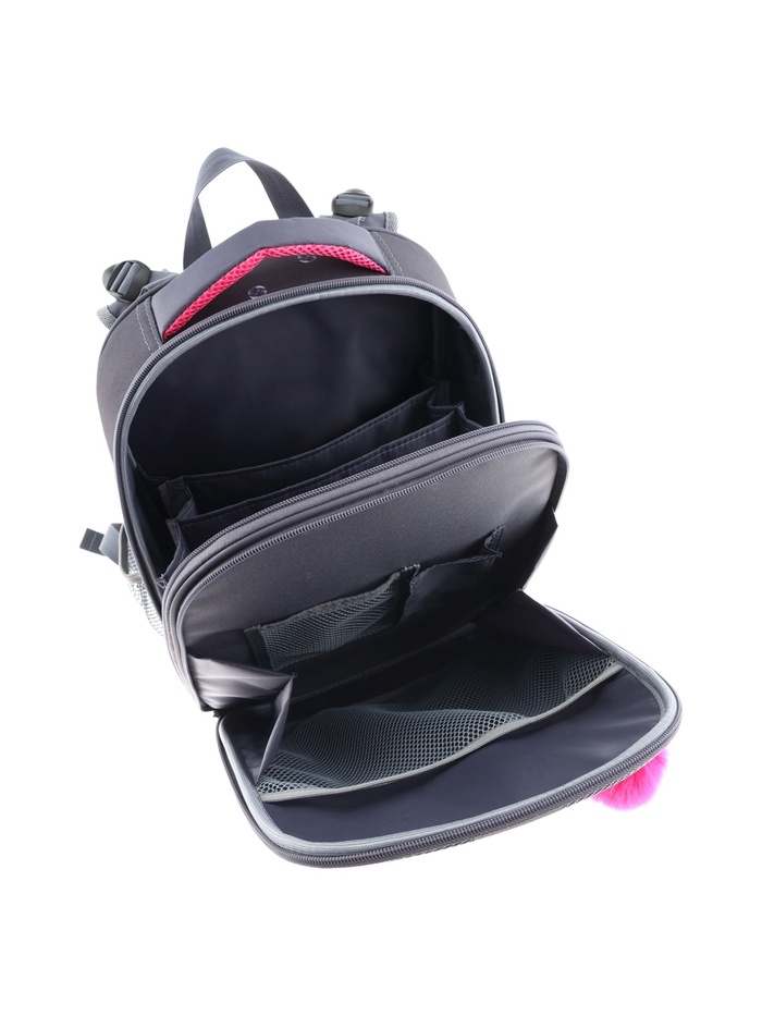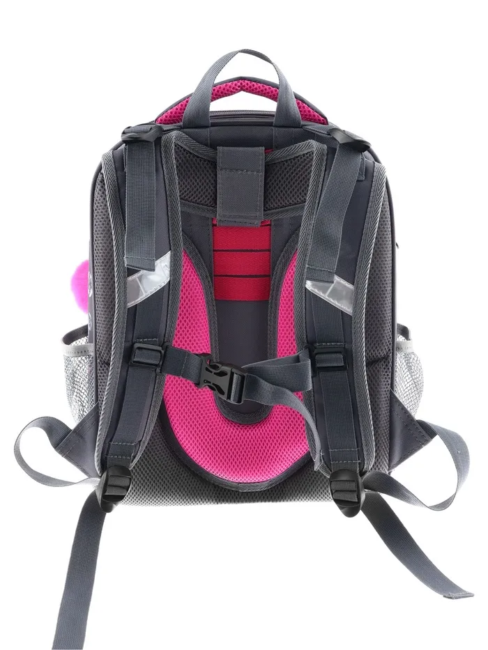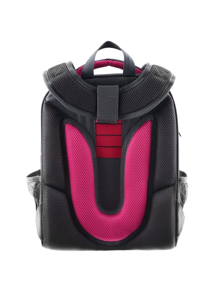 Плотная спинка с анатомическими элементами дополнительно укреплена пластиком, сверху – дышащая трехслойная сетка. Лямки-маечка плотные, мягкие. Регулируются по длине и высоте, что позволяет без труда отрегулировать их по росту ребенка. Ранец снабжен надежным нагрудным фиксатором и двумя боковыми карманами из прочной сетки. Есть удобная мягкая ручка для переноски и дополнительная петлевая ручка для размещения ранца на крюке