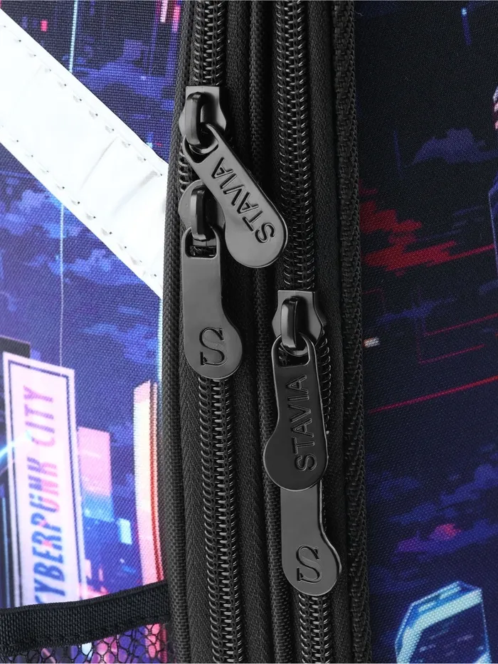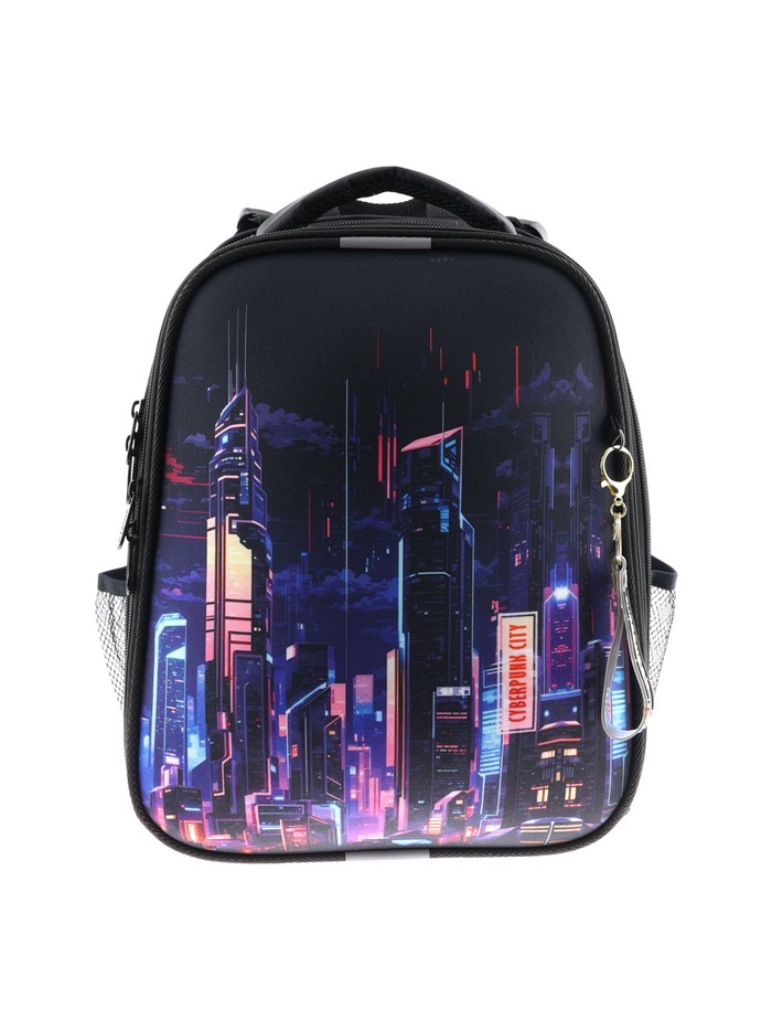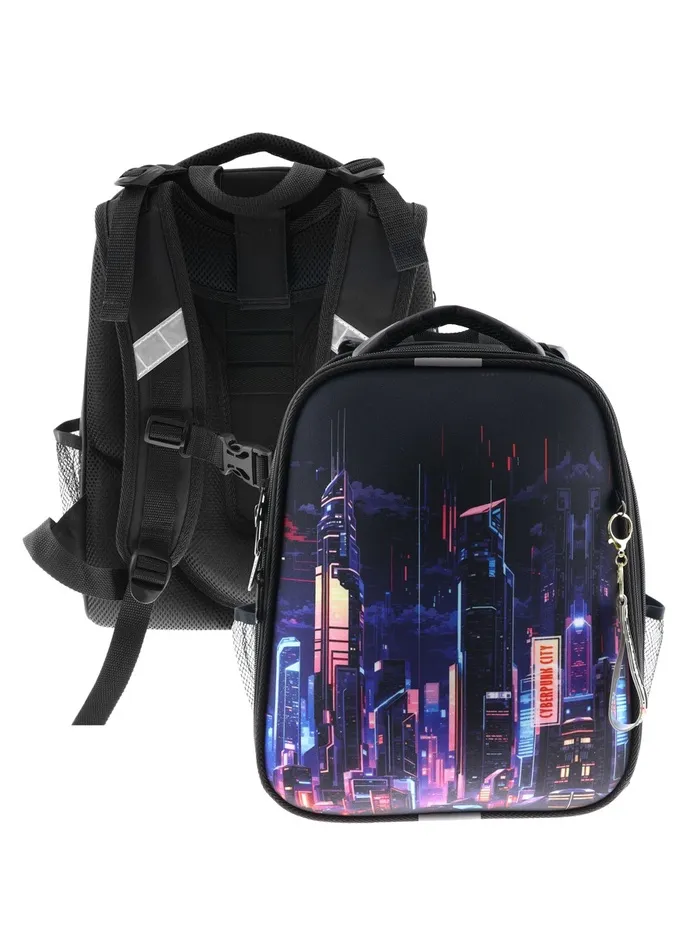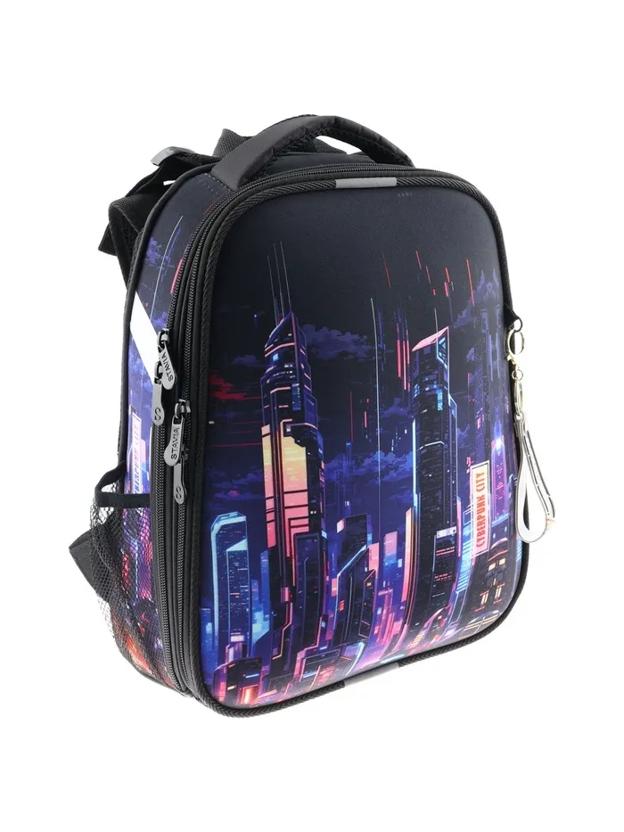 Ранец изготовлен из формованного EVA-материала и высокопрочного непромокаемого полиэстера. Размер 30 х 38 х 16 см. Вес 900 г. Прочные формованные стенки и дно ранца позволяют надежно защитить содержимое от влаги, загрязнений и предотвращают его замятие. Ранец с двумя вместительными отделениями, закрывающимися на реверсивную пластиковую молнию с металлическими «бегунками»; в первом — «плавающие» перегородки для тетрадей и учебников, во втором – большой карман из сетки и карманы-органайзеры для канцелярских принадлежностей
