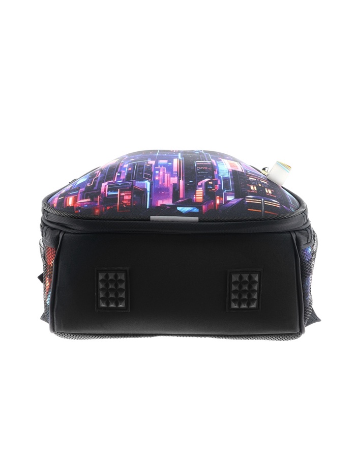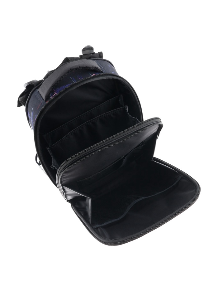 Плотная спинка с анатомическими элементами дополнительно укреплена пластиком, сверху – дышащая трехслойная сетка. Лямки-маечка плотные, мягкие. Регулируются по длине и высоте, что позволяет без труда отрегулировать их по росту ребенка. Ранец снабжен надежным нагрудным фиксатором и двумя боковыми карманами из прочной сетки. Есть удобная мягкая ручка для переноски и дополнительная петлевая ручка для размещения ранца на крюке