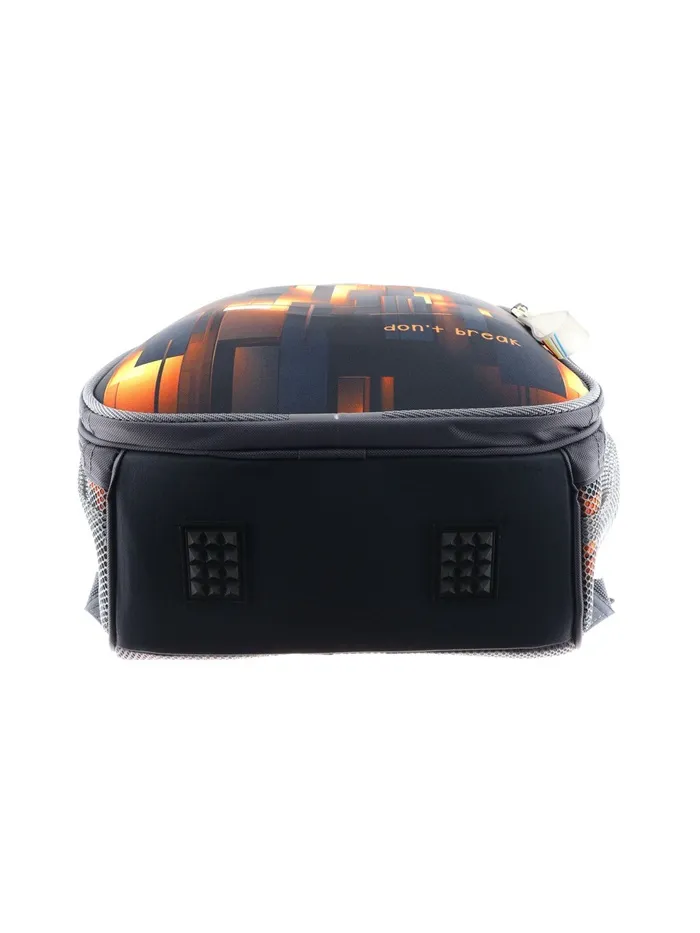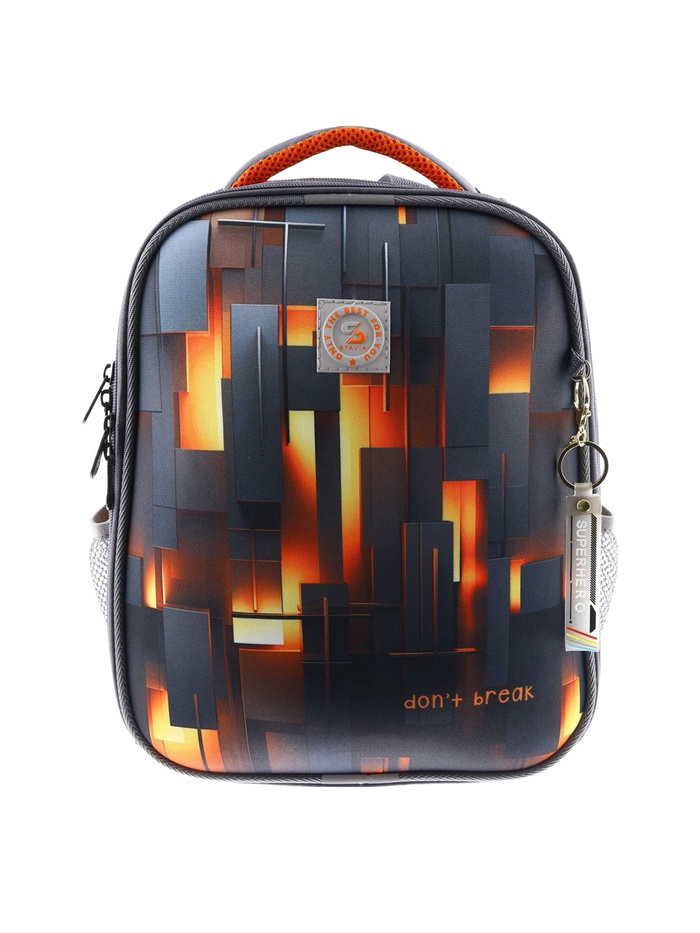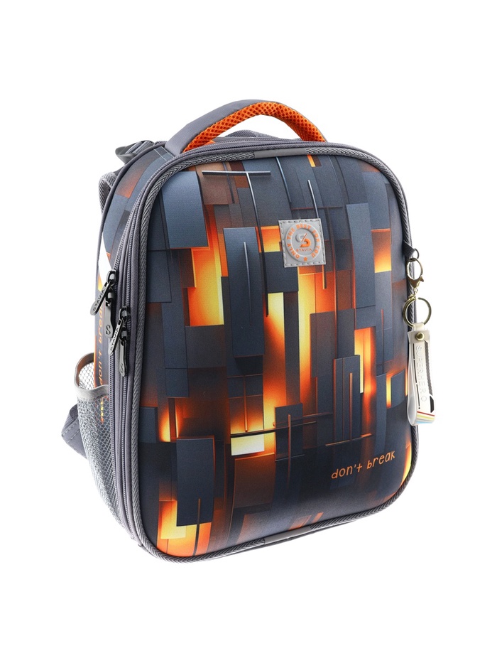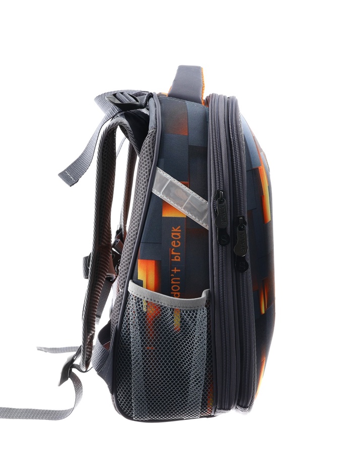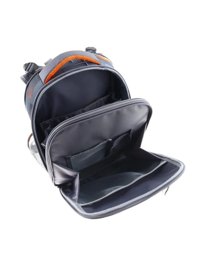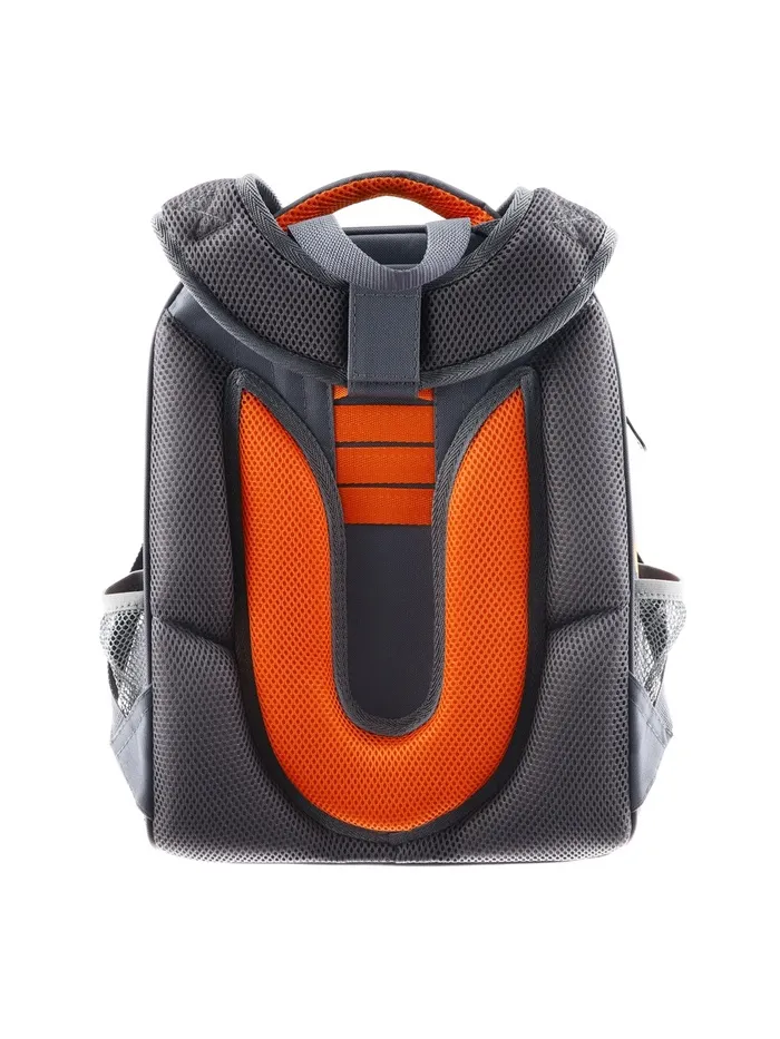 Ранец изготовлен из формованного EVA-материала и высокопрочного непромокаемого полиэстера. Размер 30 х 38 х 16 см. Вес 900 г. Прочные формованные стенки и дно ранца позволяют надежно защитить содержимое от влаги, загрязнений и предотвращают его замятие. Ранец с двумя вместительными отделениями, закрывающимися на реверсивную пластиковую молнию с металлическими «бегунками»; в первом — «плавающие» перегородки для тетрадей и учебников, во втором – большой карман из сетки и карманы-органайзеры для канцелярских принадлежностей. Плотная спинка с анатомическими элементами дополнительно укреплена пластиком, сверху – дышащая трехслойная сетка
