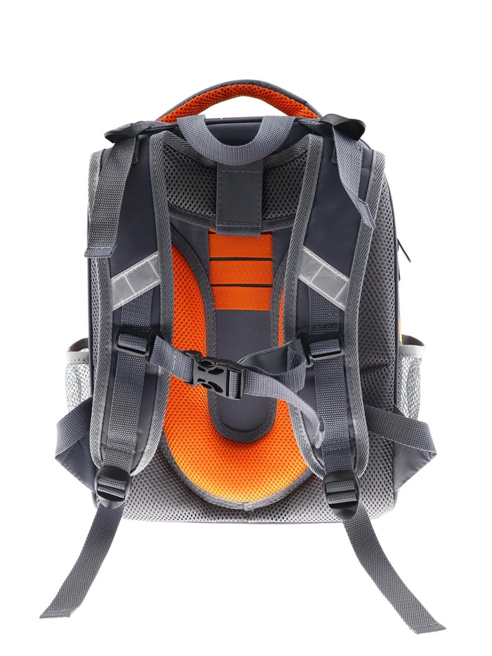 Лямки-маечка плотные, мягкие. Регулируются по длине и высоте, что позволяет без труда отрегулировать их по росту ребенка. Ранец снабжен надежным нагрудным фиксатором и двумя боковыми карманами из прочной сетки. Есть удобная мягкая ручка для переноски и дополнительная петлевая ручка для размещения ранца на крюке