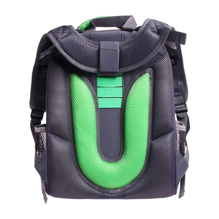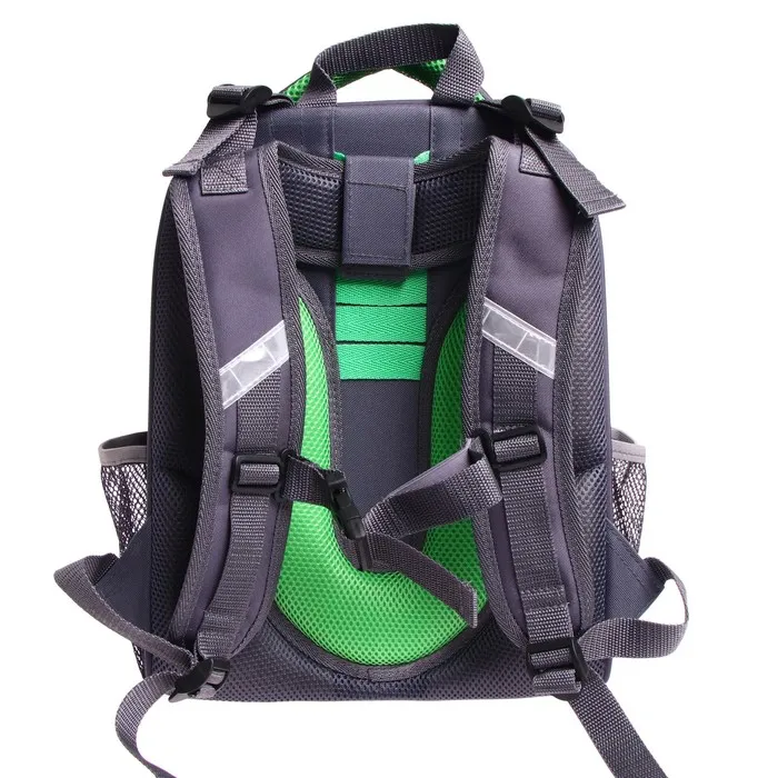 Ранец изготовлен из формованного EVA-материала и высокопрочного непромокаемого полиэстера. Размер 30 х 38 х 16 см. Вес 900 г. Прочные формованные стенки и дно ранца позволяют надежно защитить содержимое от влаги, загрязнений и предотвращают его замятие. Ранец с двумя вместительными отделениями, закрывающимися на реверсивную пластиковую молнию с металлическими «бегунками»; в первом — «плавающие» перегородки для тетрадей и учебников, во втором – большой карман из сетки и карманы-органайзеры для канцелярских принадлежностей. Плотная спинка с анатомическими элементами дополнительно укреплена пластиком, сверху – дышащая трехслойная сетка. Лямки-маечка плотные, мягкие. Регулируются по длине и высоте, что позволяет без труда отрегулировать их по росту ребенка. Ранец снабжен надежным нагрудным фиксатором. Есть удобная мягкая ручка для переноски и дополнительная петлевая ручка для размещения ранца на крюке. На дне ранца есть две пластиковые ножки. В соответствии с требованиями к безопасности на дороге, ранец имеет светоотражающие элементы на лямках и корпусе.