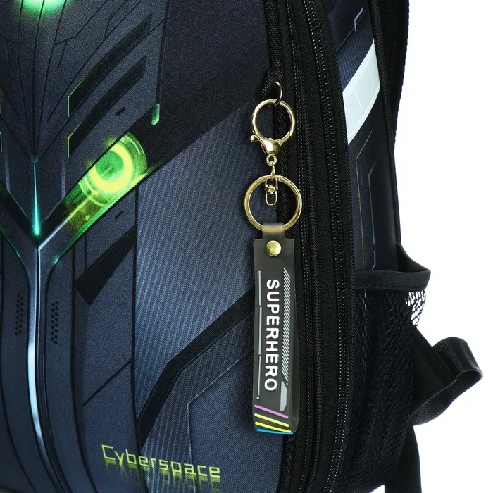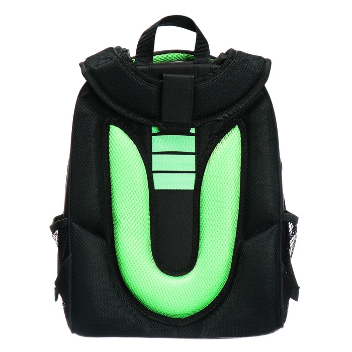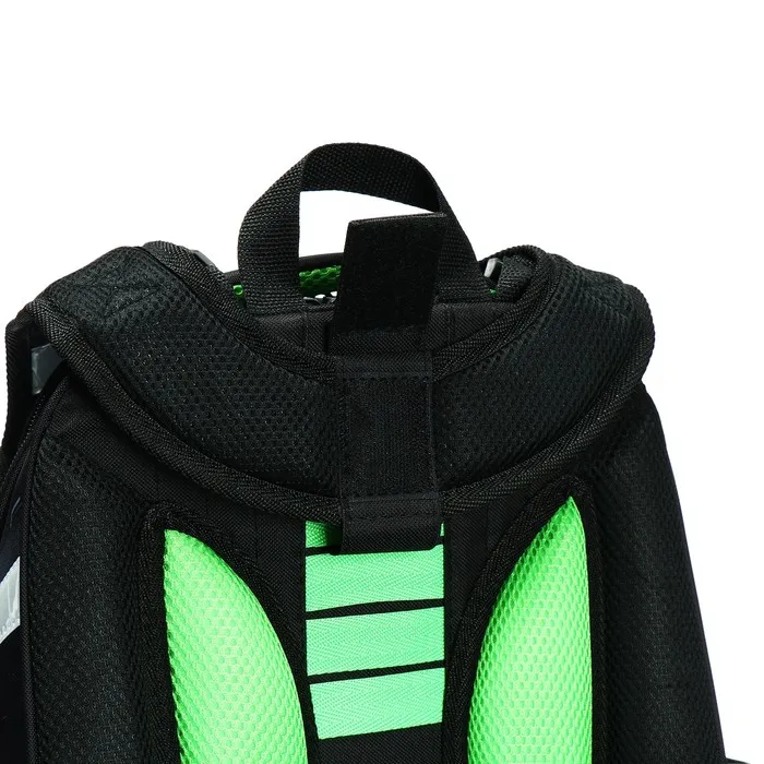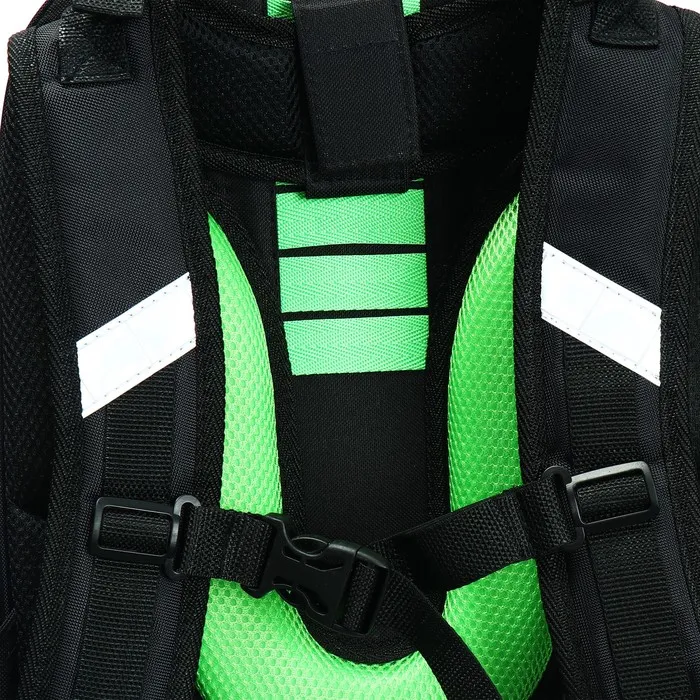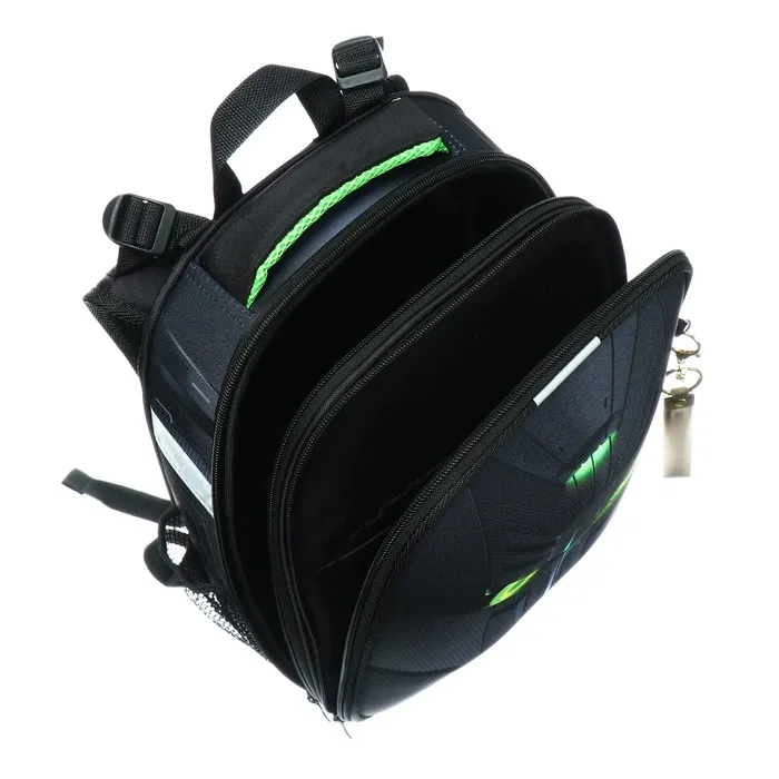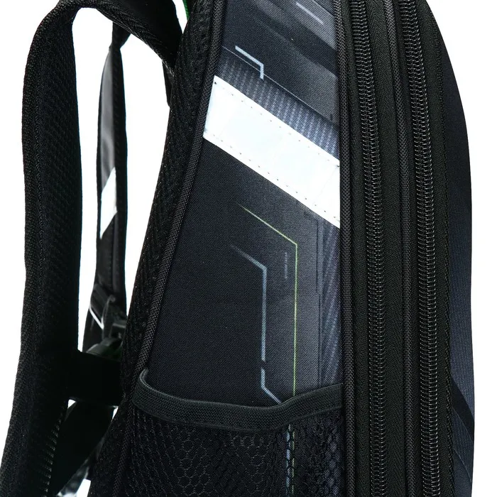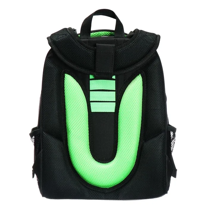 Ранец из формованного EVA-материала и высокопрочного непромокаемого полиэстера. Два вместительных отделения на реверсивной пластиковой молнии; в первом — «плавающие» перегородки для тетрадей и учебников, во втором – большой карман из сетки и карманы-органайзеры. Спинка с анатомическими элементами дополнительно укреплена пластиком, сверху – дышащая трехслойная сетка. Лямки-маечка плотные, мягкие. Регулируются по длине и высоте. Ранец снабжен нагрудным фиксатором и двумя боковыми карманами из прочной сетки. Есть мягкая ручка для переноски и дополнительная петлевая ручка для размещения ранца на крюке. На дне две пластиковые ножки. Ранец имеет светоотражающие элементы на лямках и корпусе. Брелок в комплекте.