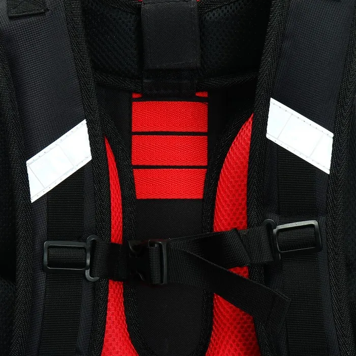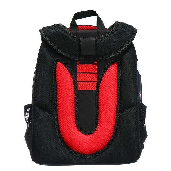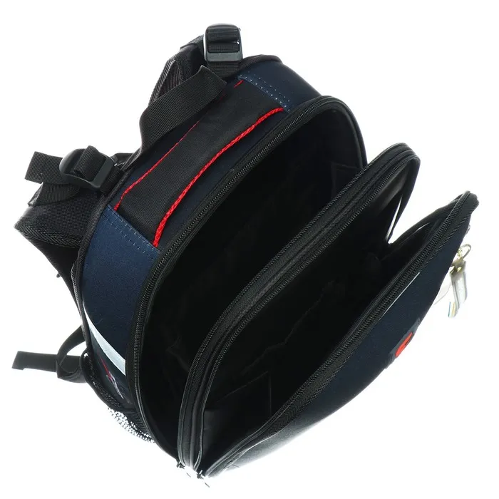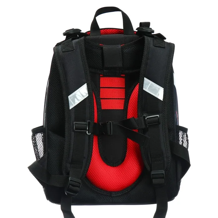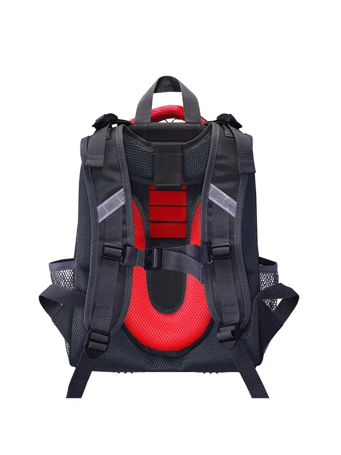 Плотная спинка с анатомическими элементами дополнительно укреплена пластиком, сверху – дышащая трехслойная сетка. Лямки-маечка плотные, мягкие. Регулируются по длине и высоте, что позволяет без труда отрегулировать их по росту ребенка. Ранец снабжен надежным нагрудным фиксатором и двумя боковыми карманами из прочной сетки. Есть удобная мягкая ручка для переноски и дополнительная петлевая ручка для размещения ранца на крюке