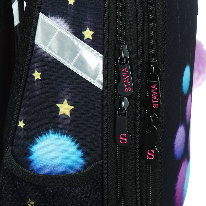 Ранец из формованного EVA-материала и высокопрочного непромокаемого полиэстера. Два вместительных отделения на реверсивной пластиковой молнии; в первом — «плавающие» перегородки для тетрадей и учебников, во втором – большой карман из сетки и карманы-органайзеры. Спинка с анатомическими элементами дополнительно укреплена пластиком, сверху – дышащая трехслойная сетка. Лямки-маечка плотные, мягкие. Регулируются по длине и высоте. Ранец снабжен нагрудным фиксатором и двумя боковыми карманами из прочной сетки. Есть мягкая ручка для переноски и дополнительная петлевая ручка для размещения ранца на крюке. На дне две пластиковые ножки. Ранец имеет светоотражающие элементы на лямках и корпусе. Брелок в комплекте.