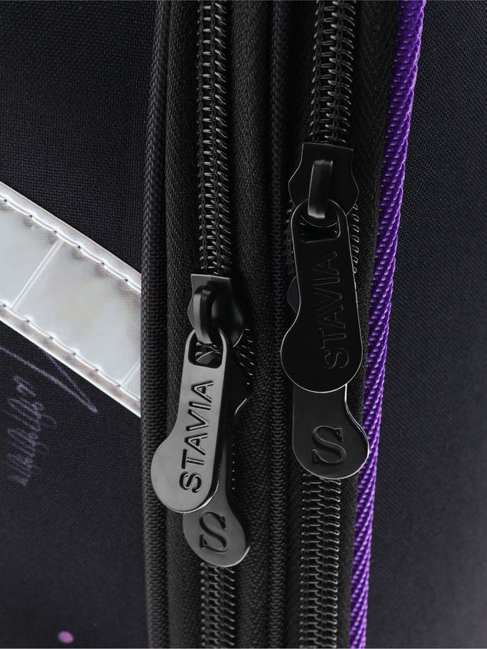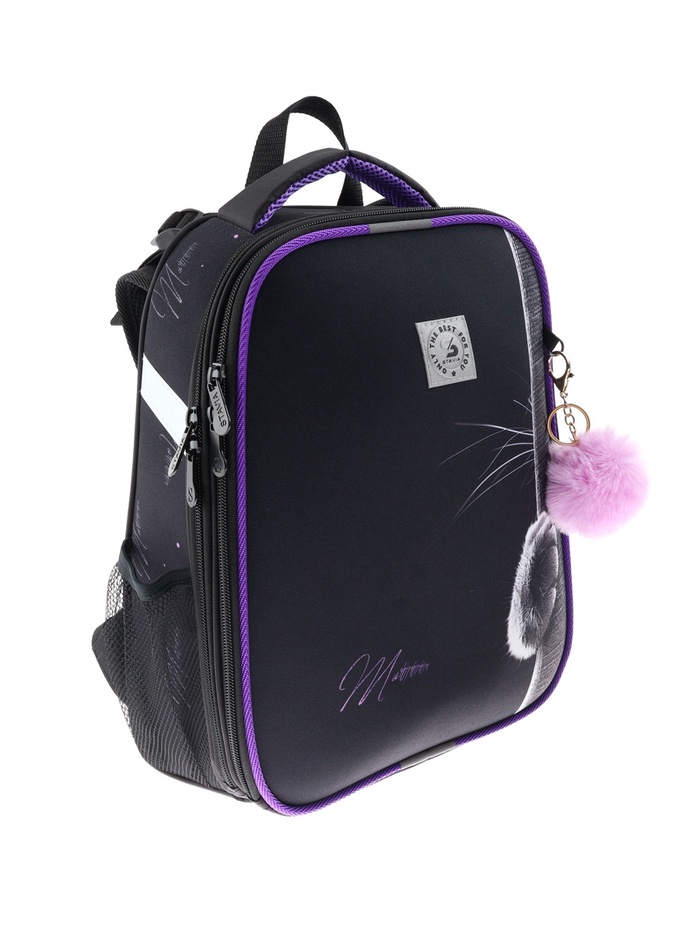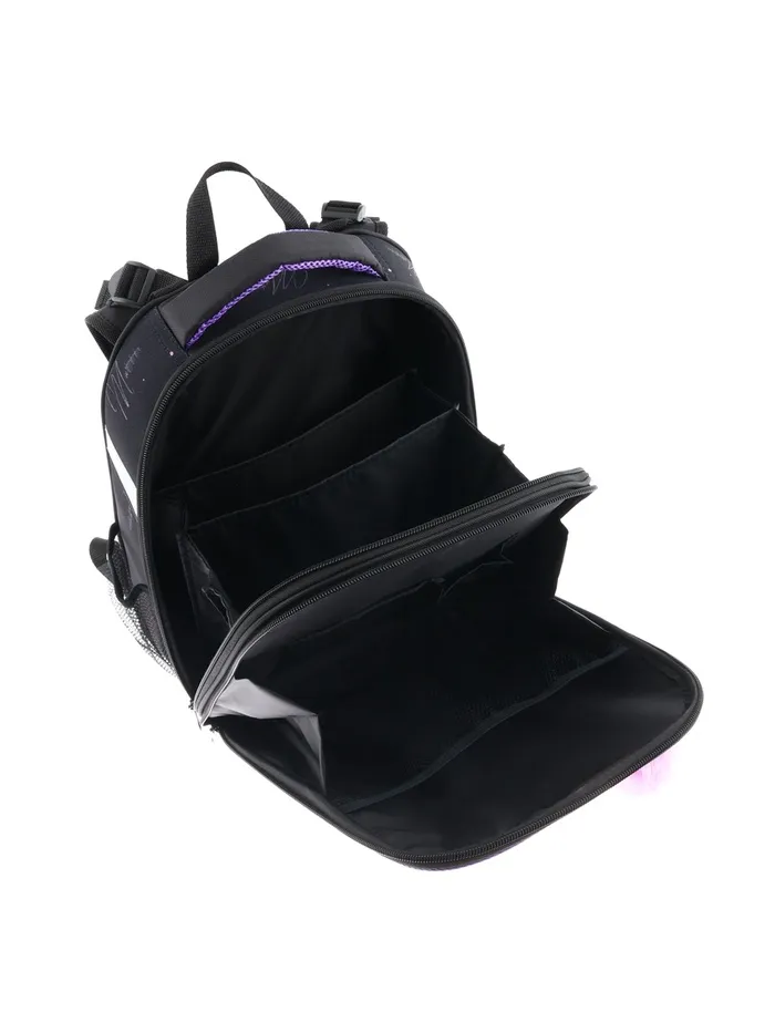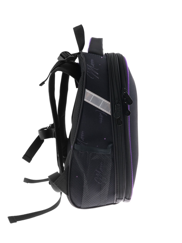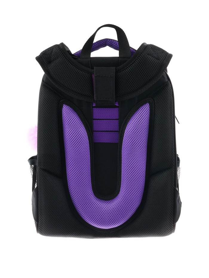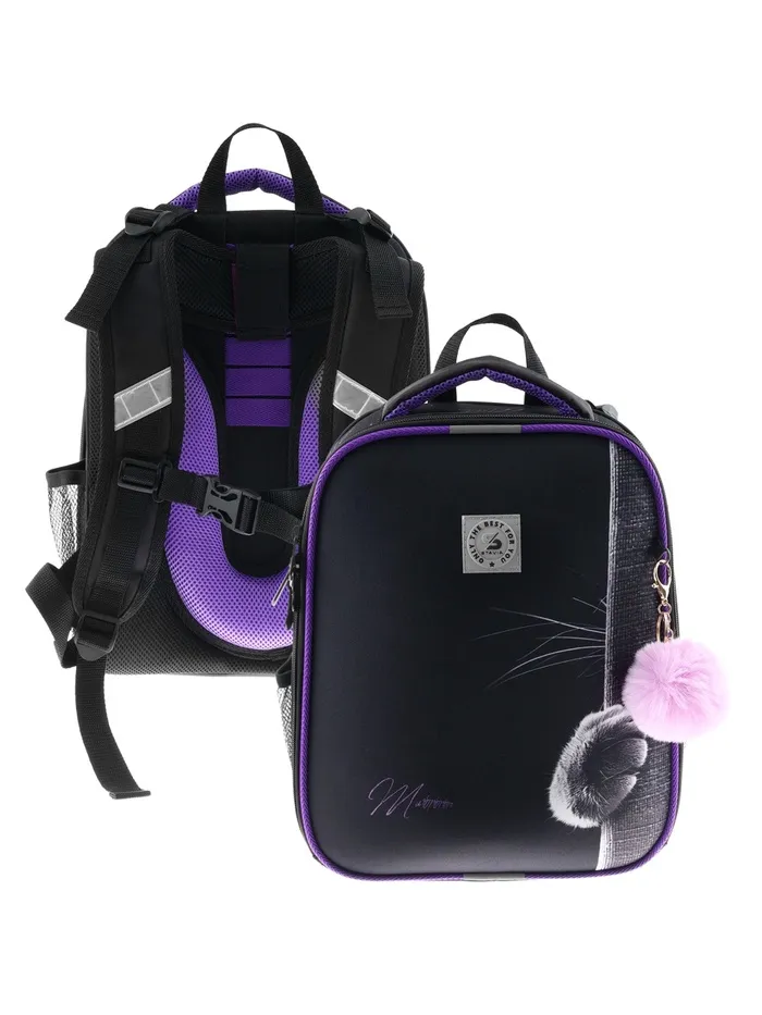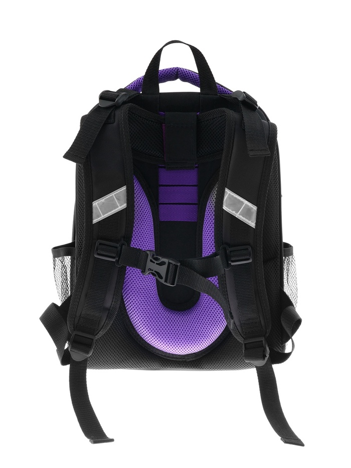 Плотная спинка с анатомическими элементами дополнительно укреплена пластиком, сверху – дышащая трехслойная сетка. Лямки-маечка плотные, мягкие. Регулируются по длине и высоте, что позволяет без труда отрегулировать их по росту ребенка. Ранец снабжен надежным нагрудным фиксатором и двумя боковыми карманами из прочной сетки. Есть удобная мягкая ручка для переноски и дополнительная петлевая ручка для размещения ранца на крюке. На дне ранца есть две пластиковые ножки. В соответствии с требованиями к безопасности на дороге, ранец имеет светоотражающие элементы на лямках и корпусе. Приятный бонус — колечко-подвес для брелока. Брелок также прилагается.