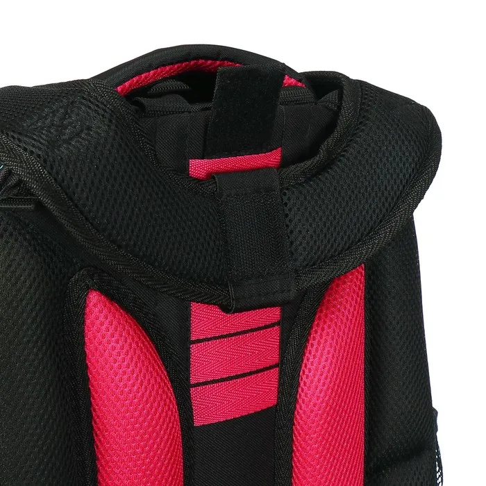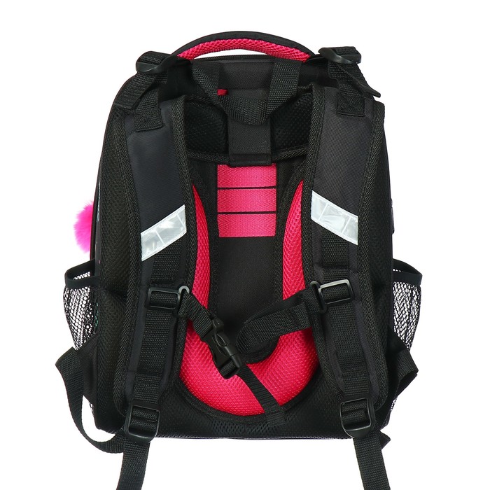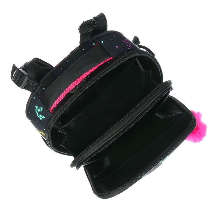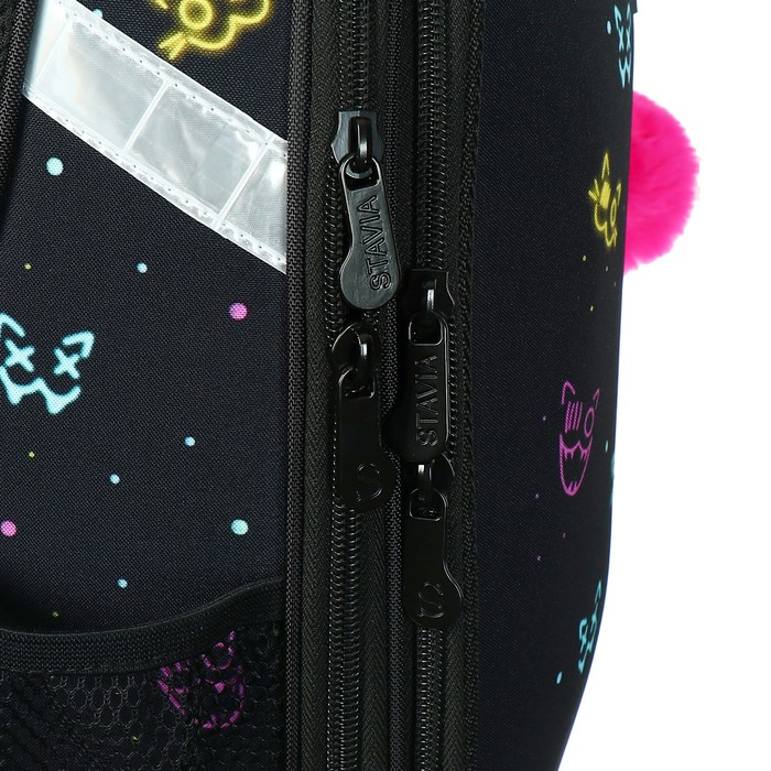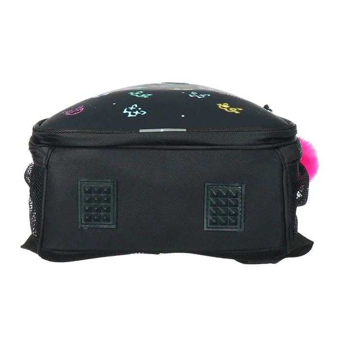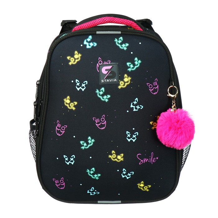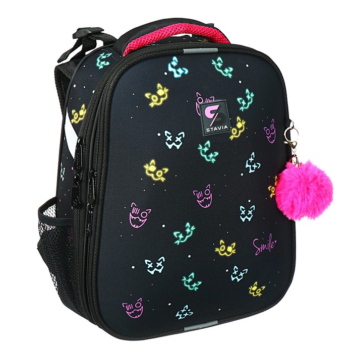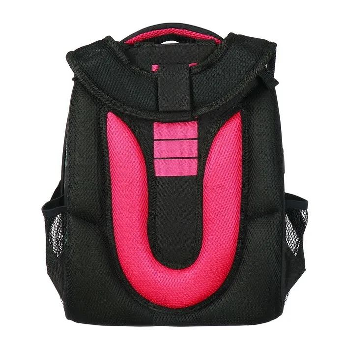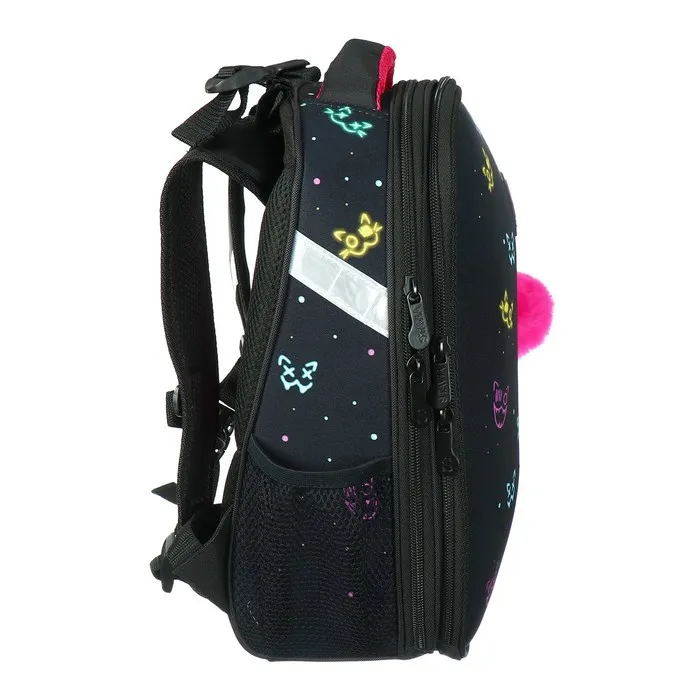 Ранец из формованного EVA-материала и высокопрочного непромокаемого полиэстера. Два вместительных отделения на реверсивной пластиковой молнии; в первом — «плавающие» перегородки для тетрадей и учебников, во втором – большой карман из сетки и карманы-органайзеры. Спинка с анатомическими элементами дополнительно укреплена пластиком, сверху – дышащая трехслойная сетка. Лямки-маечка плотные, мягкие. Регулируются по длине и высоте. Ранец снабжен нагрудным фиксатором и двумя боковыми карманами из прочной сетки. Есть мягкая ручка для переноски и дополнительная петлевая ручка для размещения ранца на крюке. На дне две пластиковые ножки. Ранец имеет светоотражающие элементы на лямках и корпусе. Брелок в комплекте.