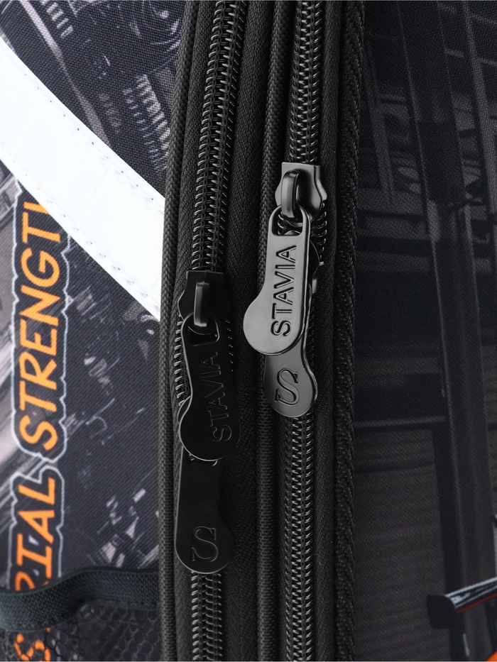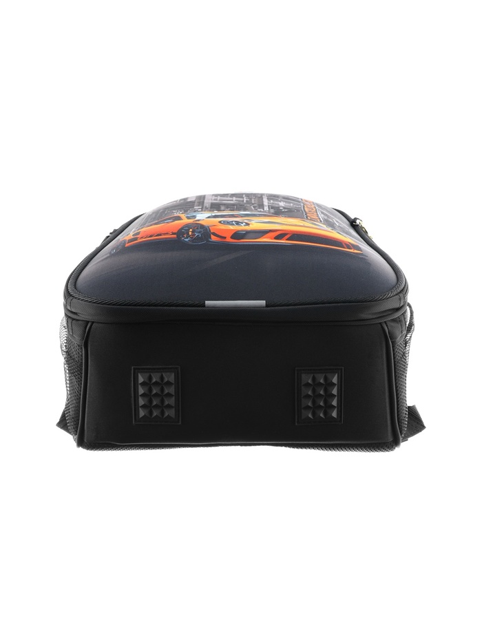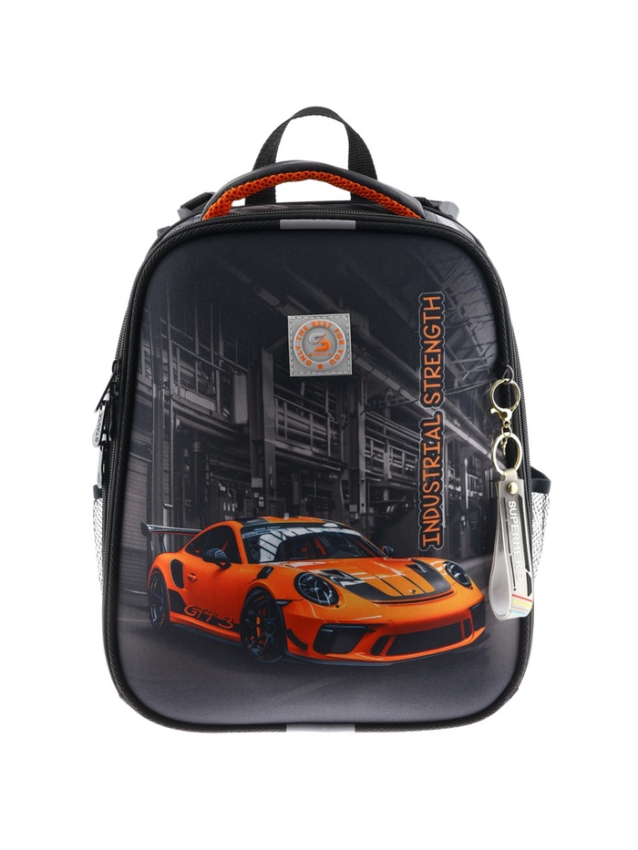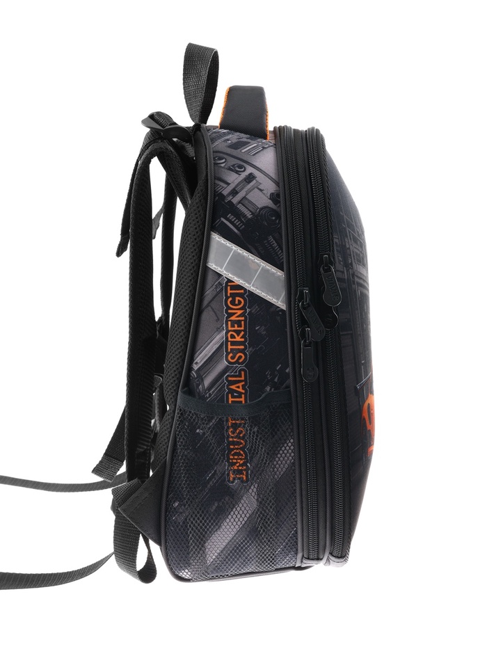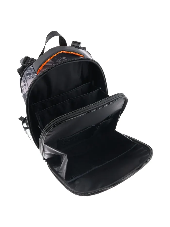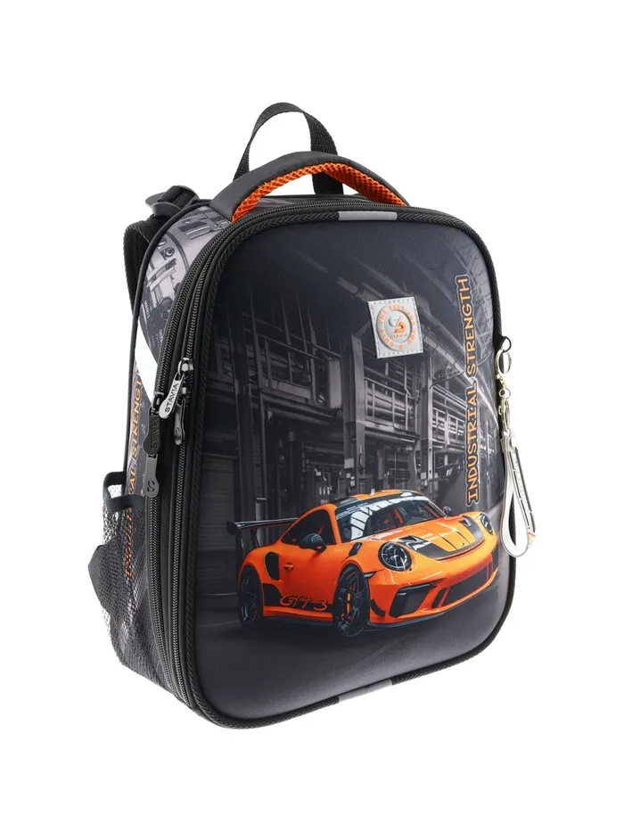 Ранец изготовлен из формованного EVA-материала и высокопрочного непромокаемого полиэстера. Размер 30 х 38 х 16 см. Вес 900 г. Прочные формованные стенки и дно ранца позволяют надежно защитить содержимое от влаги, загрязнений и предотвращают его замятие. Ранец с двумя вместительными отделениями, закрывающимися на реверсивную пластиковую молнию с металлическими «бегунками»; в первом — «плавающие» перегородки для тетрадей и учебников, во втором – большой карман из сетки и карманы-органайзеры для канцелярских принадлежностей