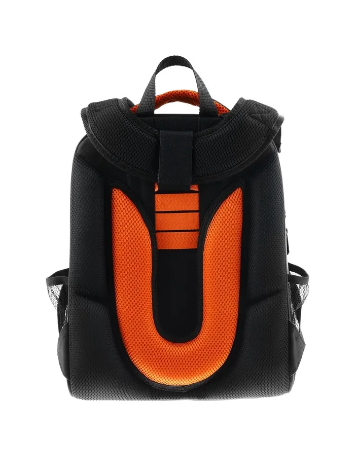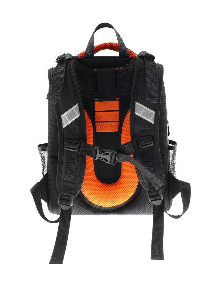 Плотная спинка с анатомическими элементами дополнительно укреплена пластиком, сверху – дышащая трехслойная сетка. Лямки-маечка плотные, мягкие. Регулируются по длине и высоте, что позволяет без труда отрегулировать их по росту ребенка. Ранец снабжен надежным нагрудным фиксатором и двумя боковыми карманами из прочной сетки. Есть удобная мягкая ручка для переноски и дополнительная петлевая ручка для размещения ранца на крюке. На дне ранца есть две пластиковые ножки