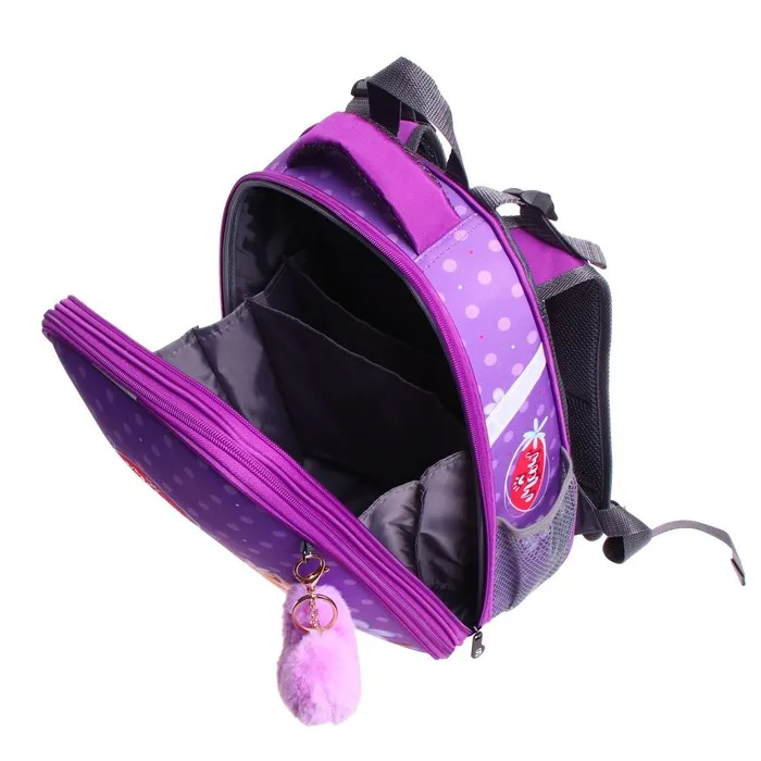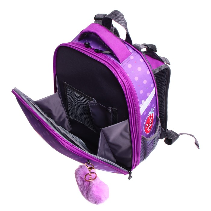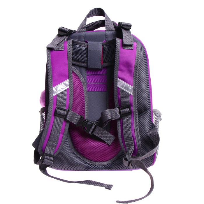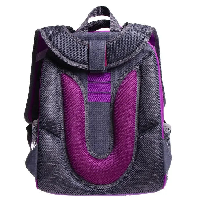 Ранец изготовлен из формованного EVA-материала и высокопрочного непромокаемого полиэстера. Размер 30 х 38 х 16 см. Вес 900 г. Прочные формованные стенки и дно ранца позволяют надежно защитить содержимое от влаги, загрязнений и предотвращают его замятие. Ранец с двумя вместительными отделениями, закрывающимися на реверсивную пластиковую молнию с металлическими «бегунками»; в первом — «плавающие» перегородки для тетрадей и учебников, во втором – большой карман из сетки и карманы-органайзеры для канцелярских принадлежностей. Плотная спинка с анатомическими элементами дополнительно укреплена пластиком, сверху – дышащая трехслойная сетка. Лямки-маечка плотные, мягкие. Регулируются по длине и высоте, что позволяет без труда отрегулировать их по росту ребенка. Ранец снабжен надежным нагрудным фиксатором. Есть удобная мягкая ручка для переноски и дополнительная петлевая ручка для размещения ранца на крюке. На дне ранца есть две пластиковые ножки. В соответствии с требованиями к безопасности на дороге, ранец имеет светоотражающие элементы на лямках и корпусе.