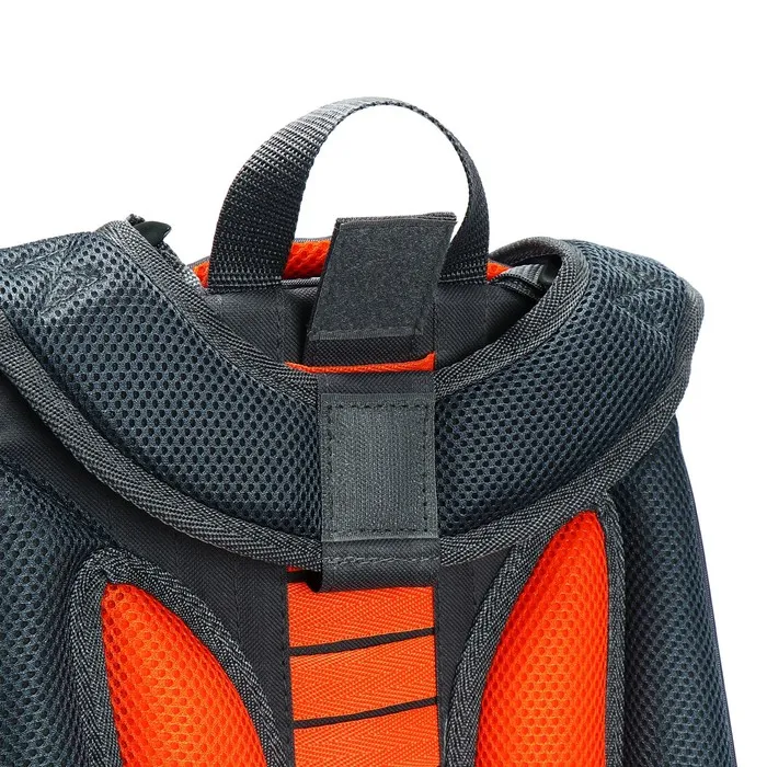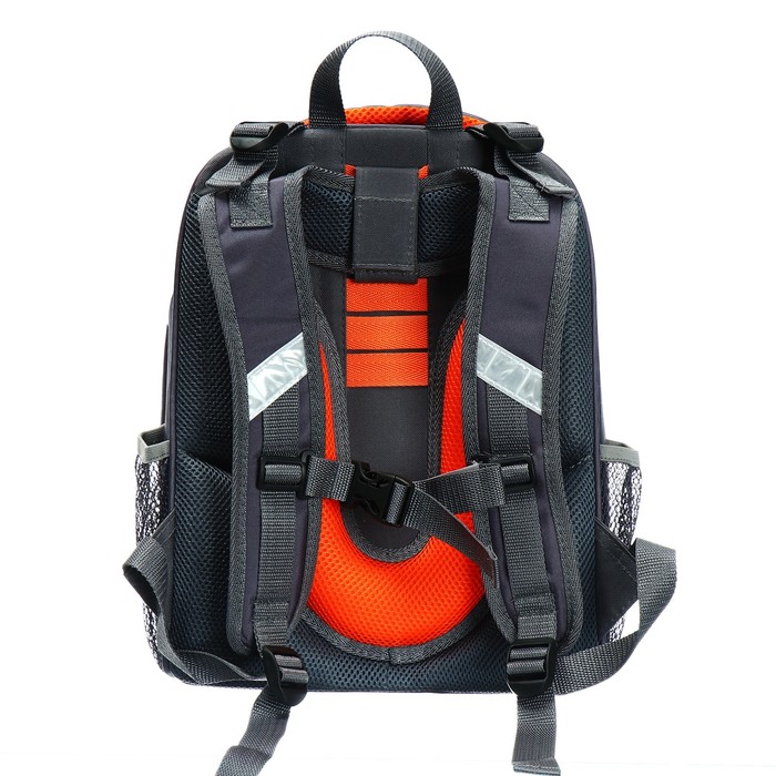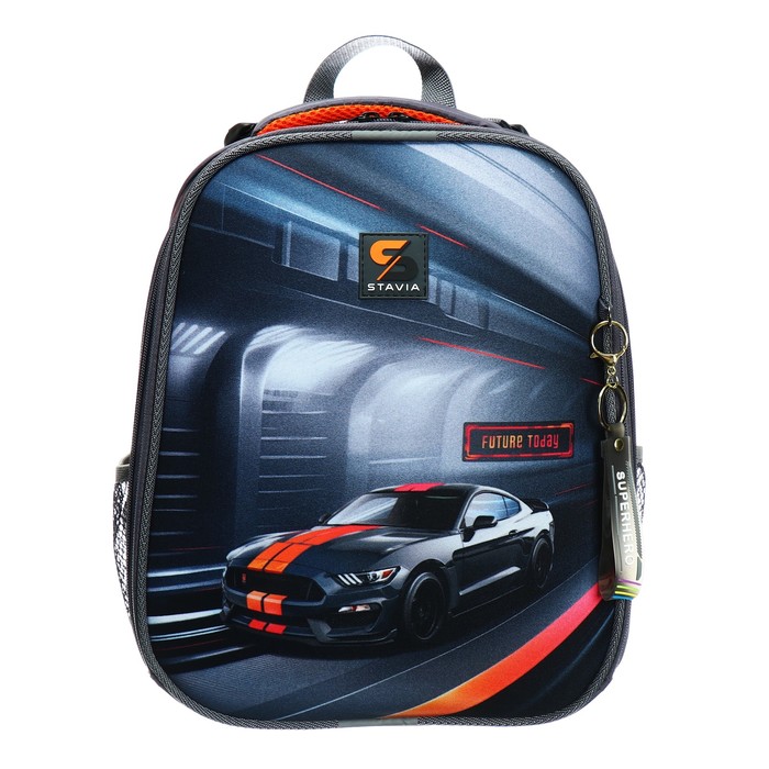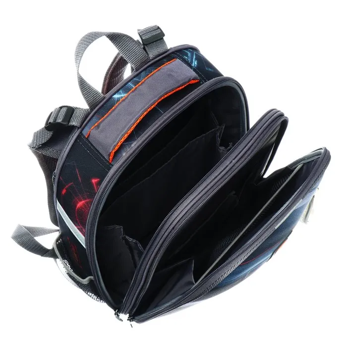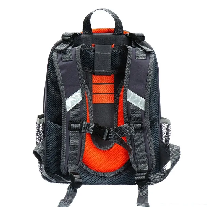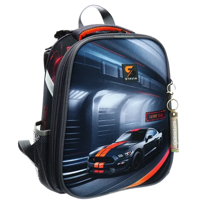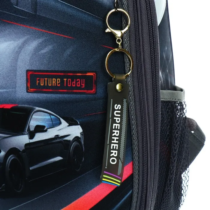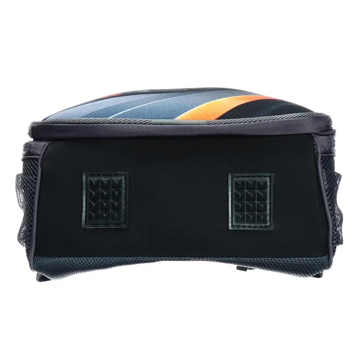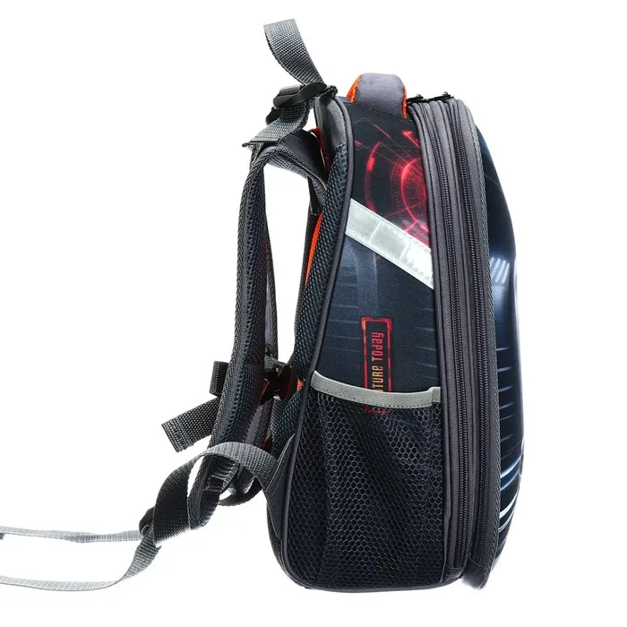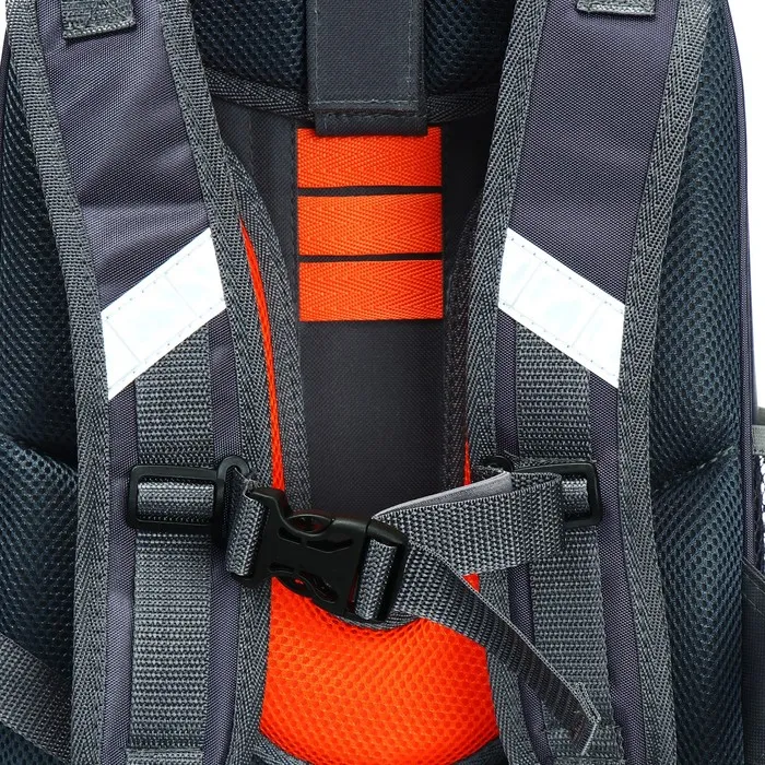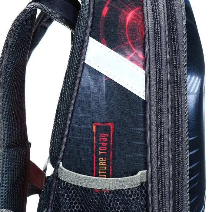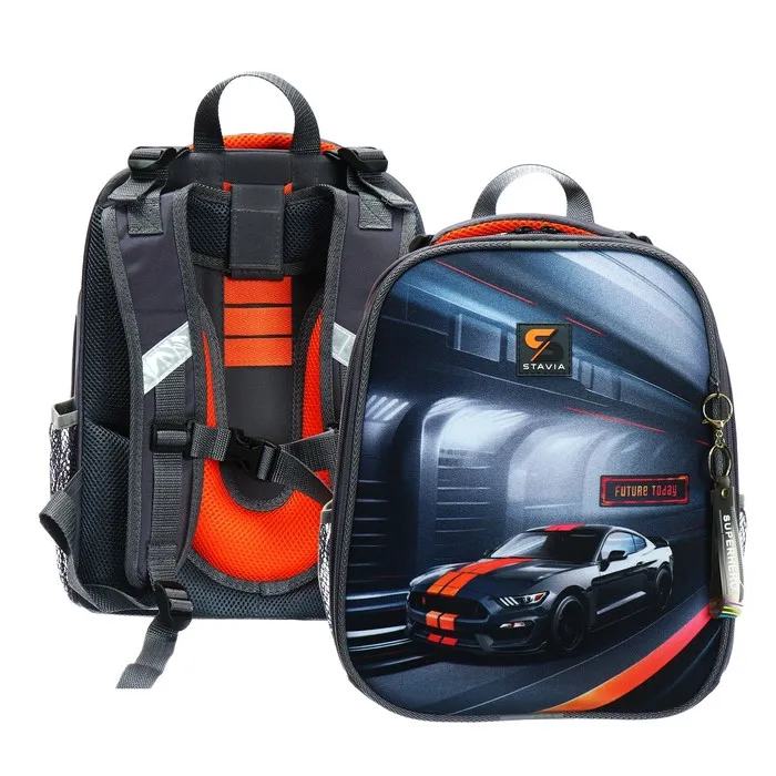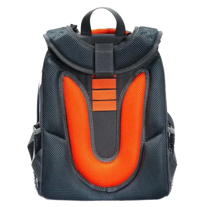 Ранец из формованного EVA-материала и высокопрочного непромокаемого полиэстера. Два вместительных отделения на реверсивной пластиковой молнии; в первом — «плавающие» перегородки для тетрадей и учебников, во втором – большой карман из сетки и карманы-органайзеры. Спинка с анатомическими элементами дополнительно укреплена пластиком, сверху – дышащая трехслойная сетка. Лямки-маечка плотные, мягкие. Регулируются по длине и высоте. Ранец снабжен нагрудным фиксатором и двумя боковыми карманами из прочной сетки. Есть мягкая ручка для переноски и дополнительная петлевая ручка для размещения ранца на крюке. На дне две пластиковые ножки. Ранец имеет светоотражающие элементы на лямках и корпусе. Брелок в комплекте.