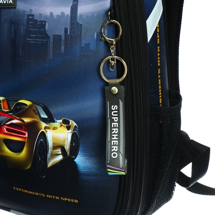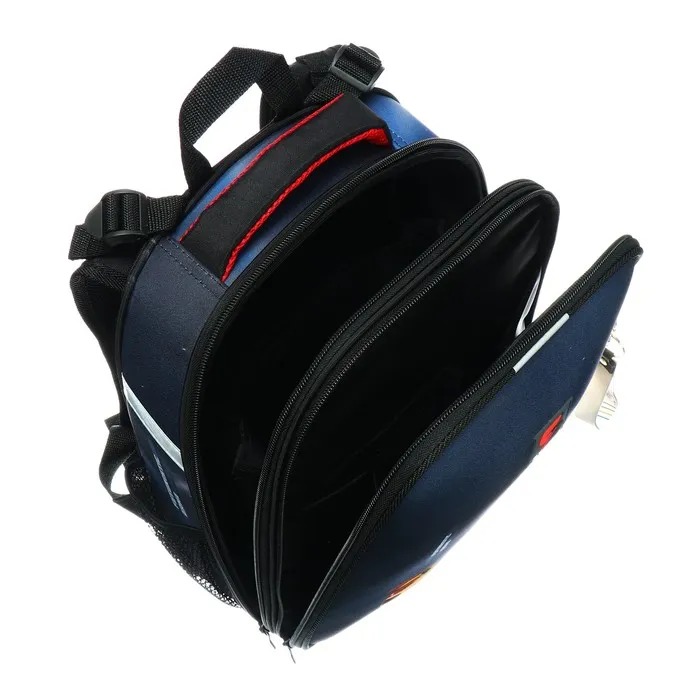 Ранец из формованного EVA-материала и высокопрочного непромокаемого полиэстера. Два вместительных отделения на реверсивной пластиковой молнии; в первом — «плавающие» перегородки для тетрадей и учебников, во втором – большой карман из сетки и карманы-органайзеры. Спинка с анатомическими элементами дополнительно укреплена пластиком, сверху – дышащая трехслойная сетка. Лямки-маечка плотные, мягкие. Регулируются по длине и высоте. Ранец снабжен нагрудным фиксатором и двумя боковыми карманами из прочной сетки. Есть мягкая ручка для переноски и дополнительная петлевая ручка для размещения ранца на крюке. На дне две пластиковые ножки. Ранец имеет светоотражающие элементы на лямках и корпусе. Брелок в комплекте.