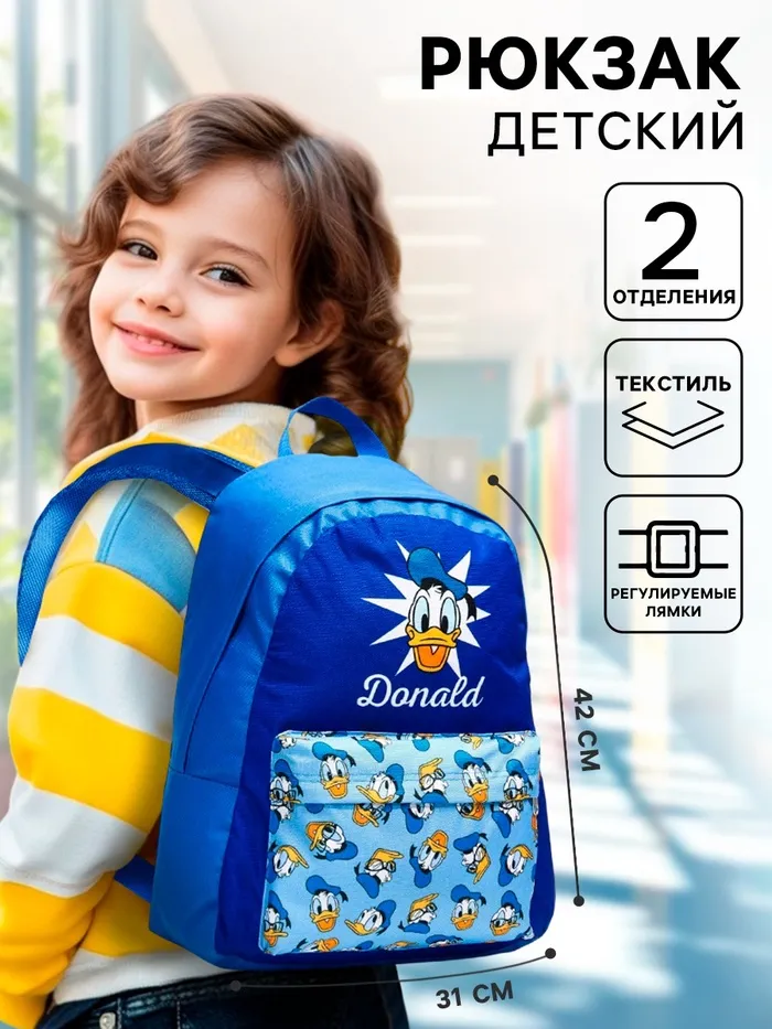 Рюкзак молодежный «Дональд Дак», на молнии, карман, синий, 42×31×15 см, Микки Маус — Характеристики