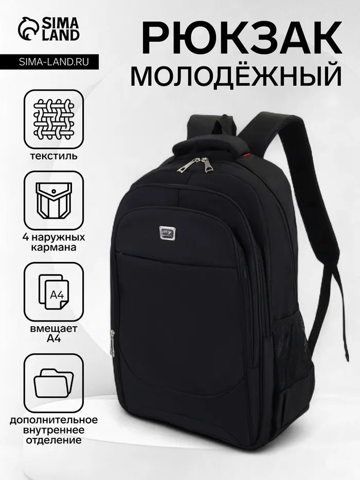 Рюкзак молодёжный на молниях, 2 отдела на молнии, с карманами, размер 37×17×54 см, чёрный — Характеристики