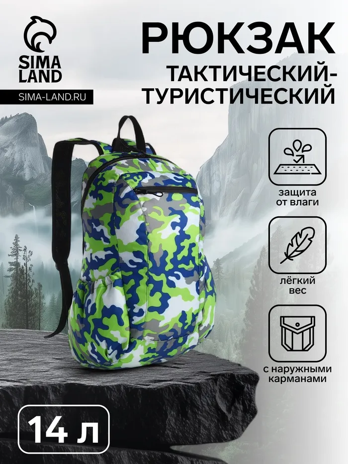 Рюкзак походный, водонепроницаемый, 14 литров, с карманами, зелёный — Характеристики