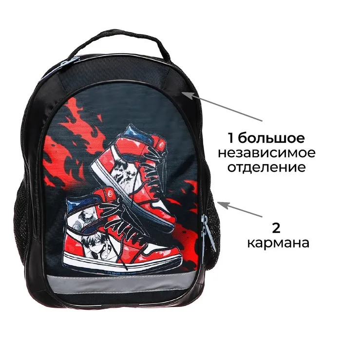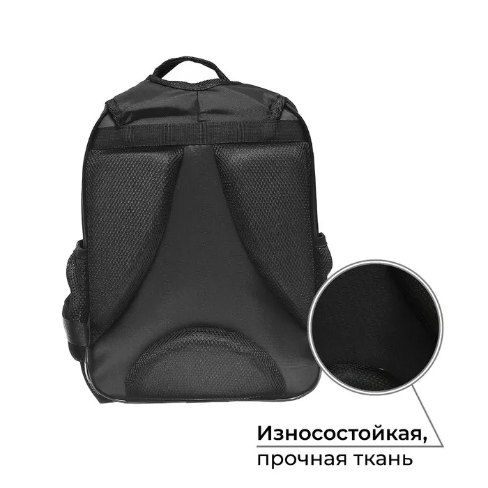 Выполнен из прочного непромокаемого материала с покрытием ПВХ, внутренняя поверхность продублирована плотной подкладочной тканью, внутренние швы окантованы. Вместительный основной отдел, дополнительный малый отдел, а также боковые карманы помогают удобно разместить ученические принадлежности.