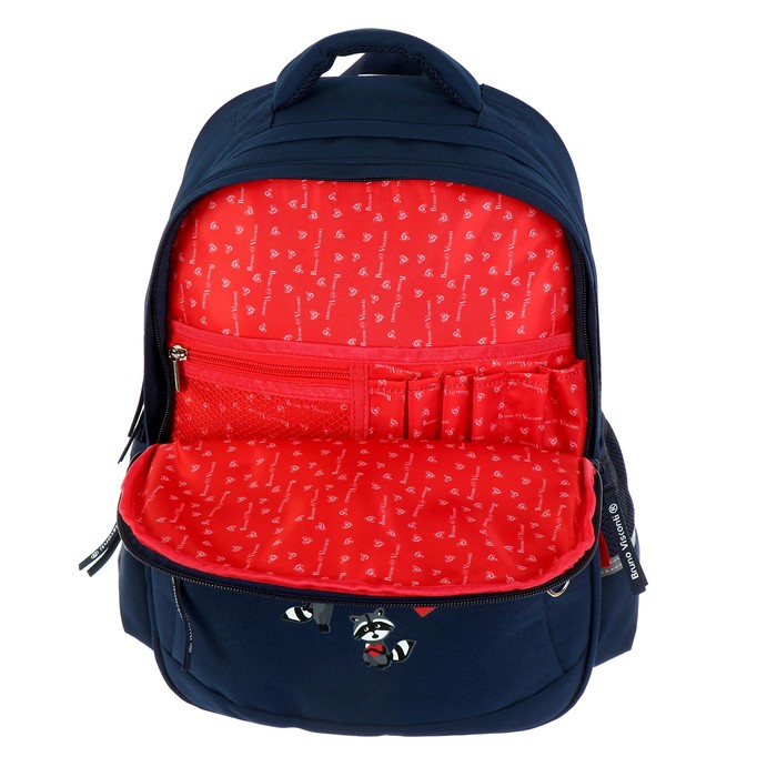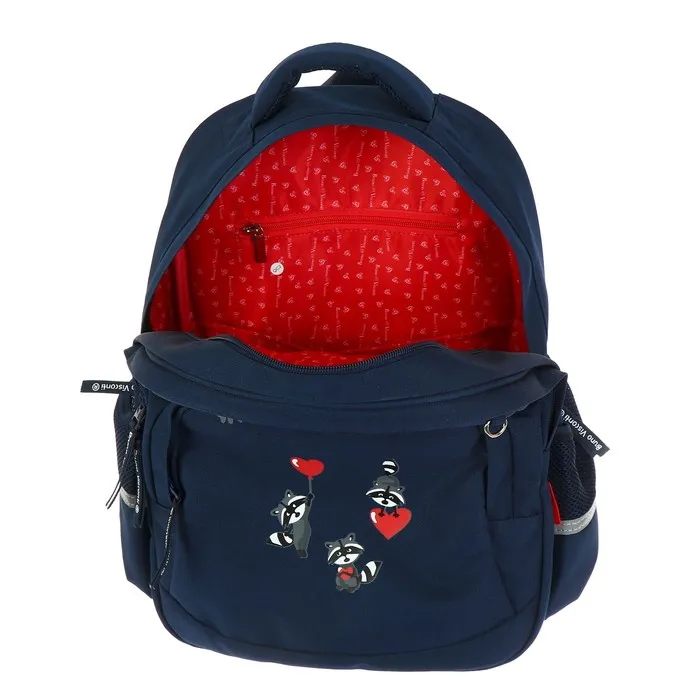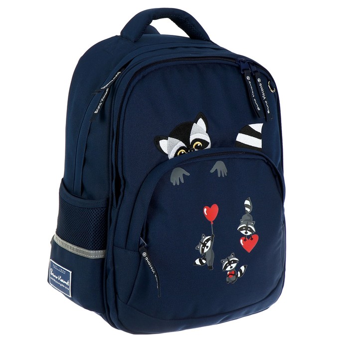 Рюкзак BrunoVisconti® классический синий с эргономичной спинкой «ЕНОТЫ,СЕРДЕЧКИ». Рюкзак школьный серии Junior «ЕНОТЫ,СЕРДЕЧКИ» ТМ BRUNO VISCONTI отличается мягкими боковыми и передними стенками при эргономичной посадке. Для его производства использовалась ткань premium качества: водонепроницаемая, морозостойкая, с повышенной износостойкостью, грязеотталкивающая плотностью 900 DEN. Благодаря сложнейшим современным технологиям нанесения на ткань рюкзак украшает авторский дизайн, соответствующий последним трендам. Плотная фирменная подкладка BRUNO VISCONTI идеально сочетается с дизайном и цветом самого рюкзака. Двунаправленные реверсивные надежные 8-мм молнии с 5-см пуллером на замках позволяют легко открывать и закрывать рюкзак. Вместительный рюкзак имеет большое отделение для тетрадей и учебников с потайным карманом и отделение для тетрадей с органайзером для канцтоваров.