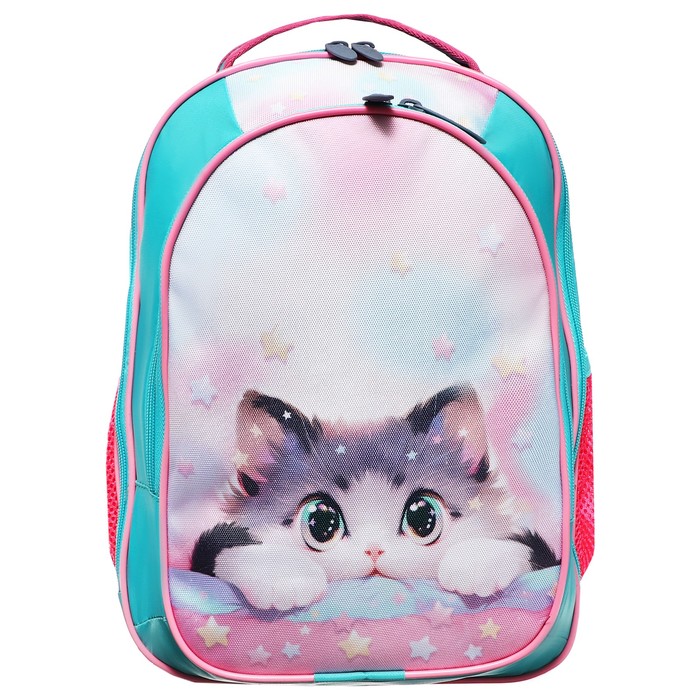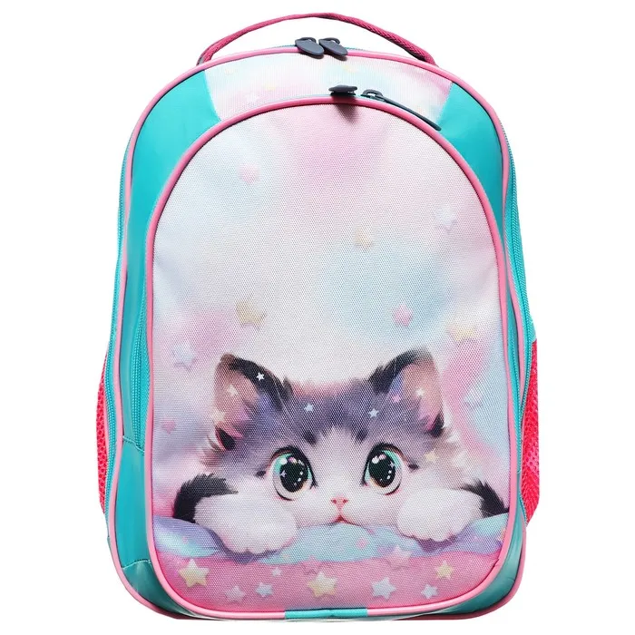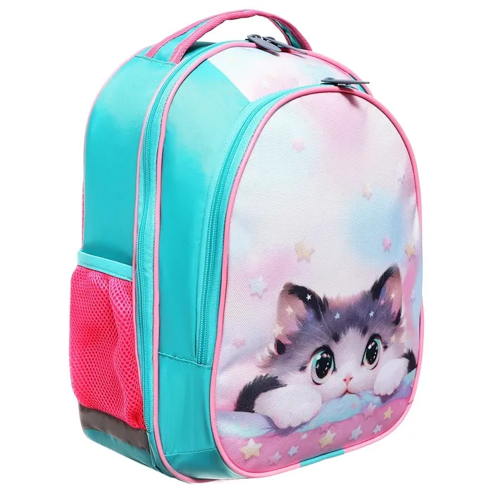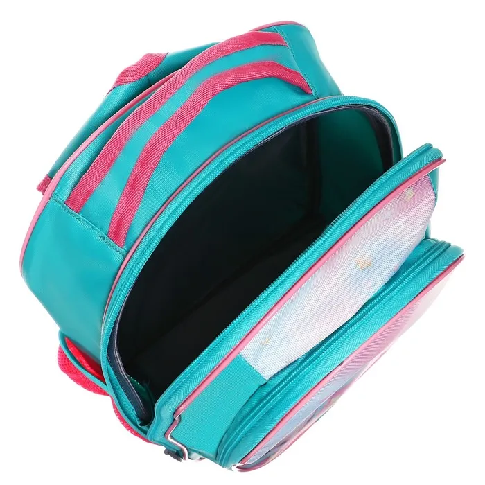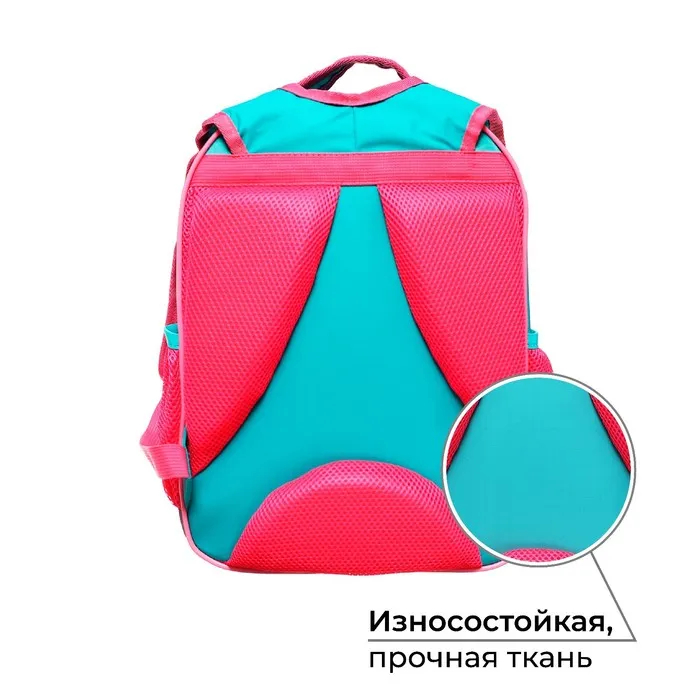 Выполнен из прочного непромокаемого материала с покрытием ПВХ, внутренняя поверхность продублирована плотной подкладочной тканью, внутренние швы окантованы. Вместительный основной отдел, дополнительный малый отдел, а также боковые карманы помогают удобно разместить ученические принадлежности.