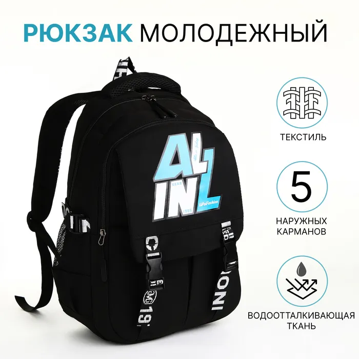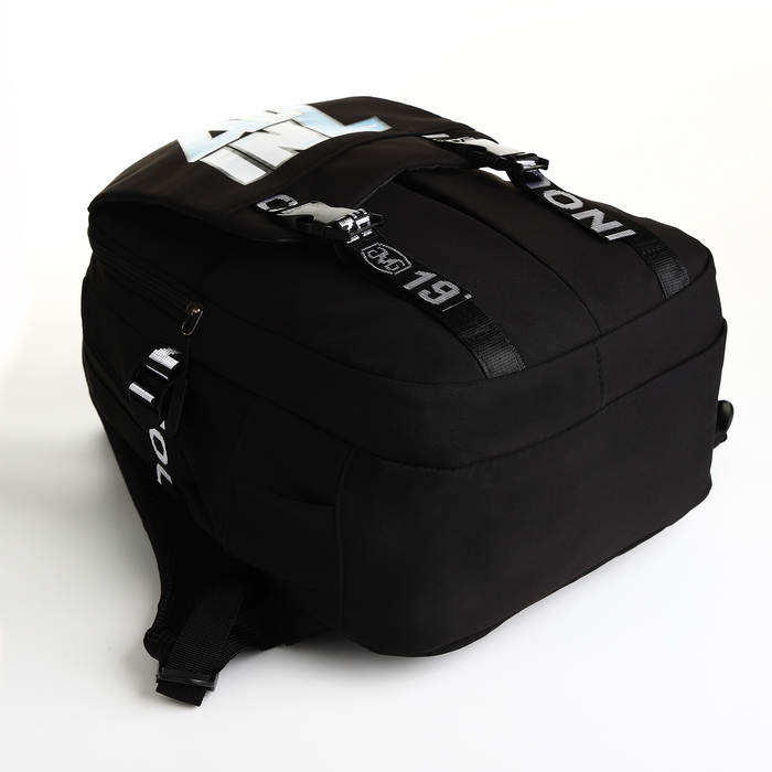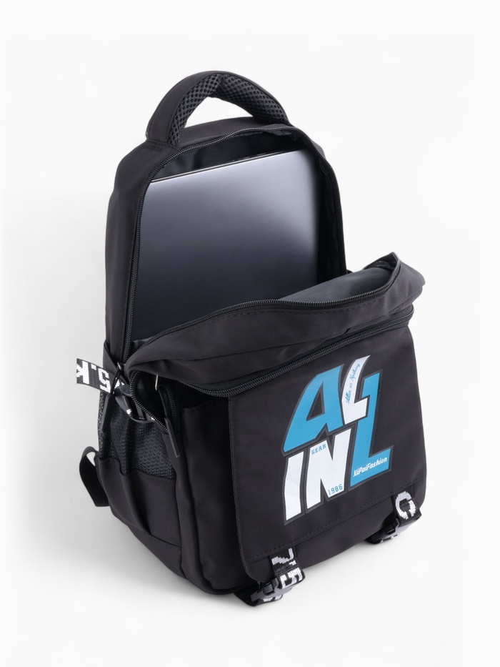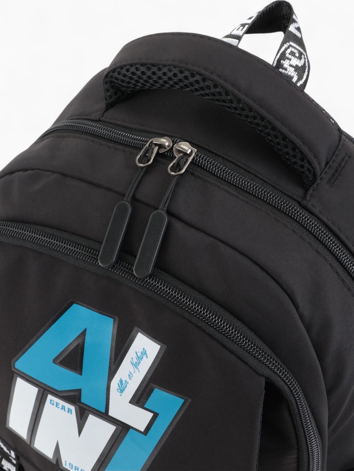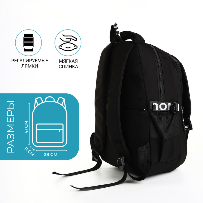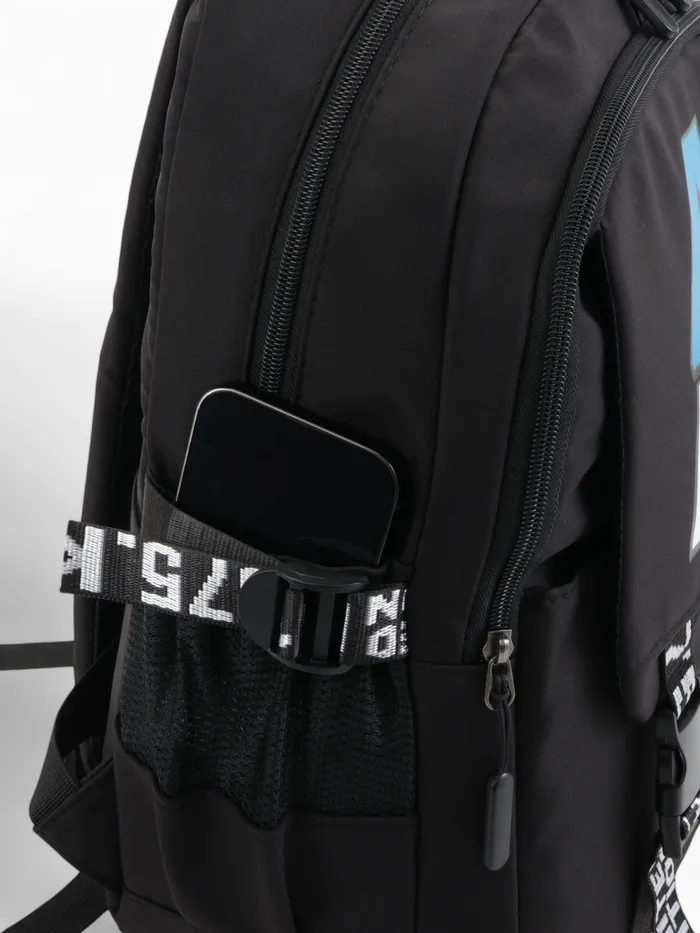 Рюкзак школьный на молнии, с карманами, принтом, размер 28×11×41 см, чёрный/голубой/белый — Характеристики