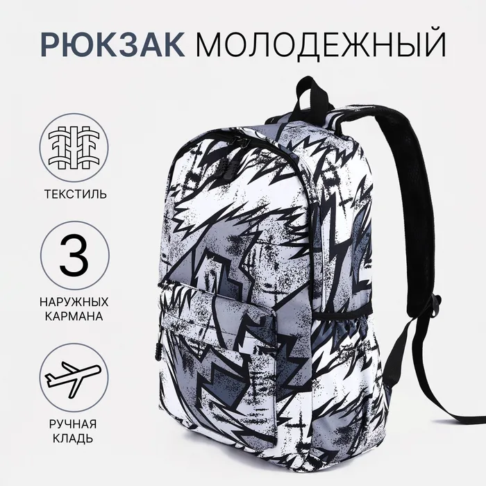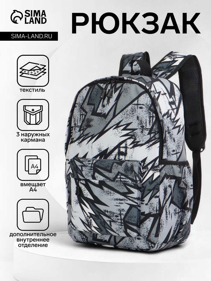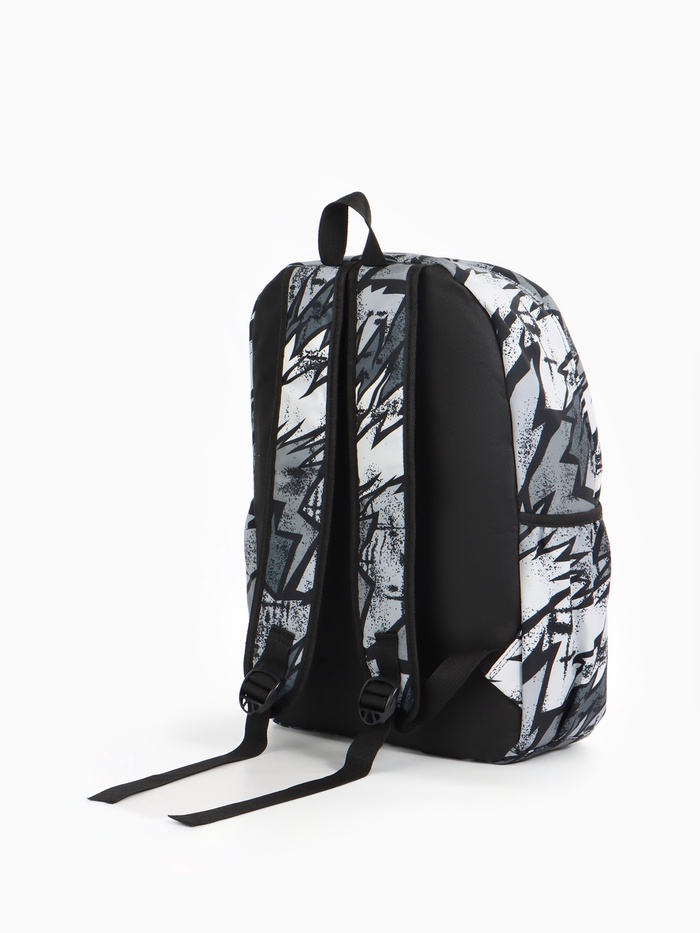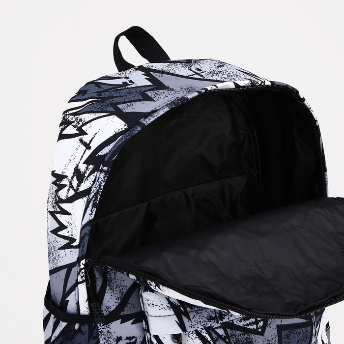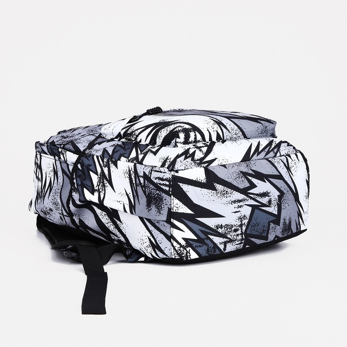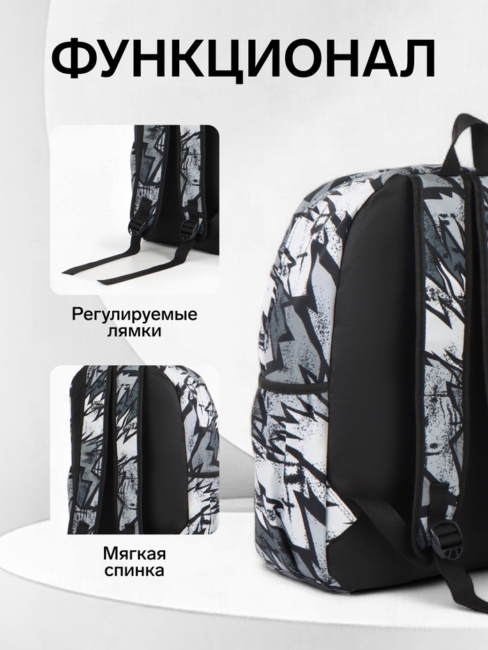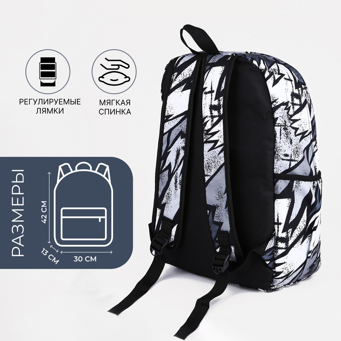 Рюкзак школьный на молнии, с карманами, с принтом, размер 30×13×42 см, чёрный/серый/белый — Характеристики