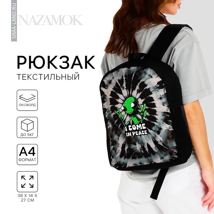 Рюкзак школьный текстильный «Инопланетянин», 38×14×27 см, чёрный — Характеристики