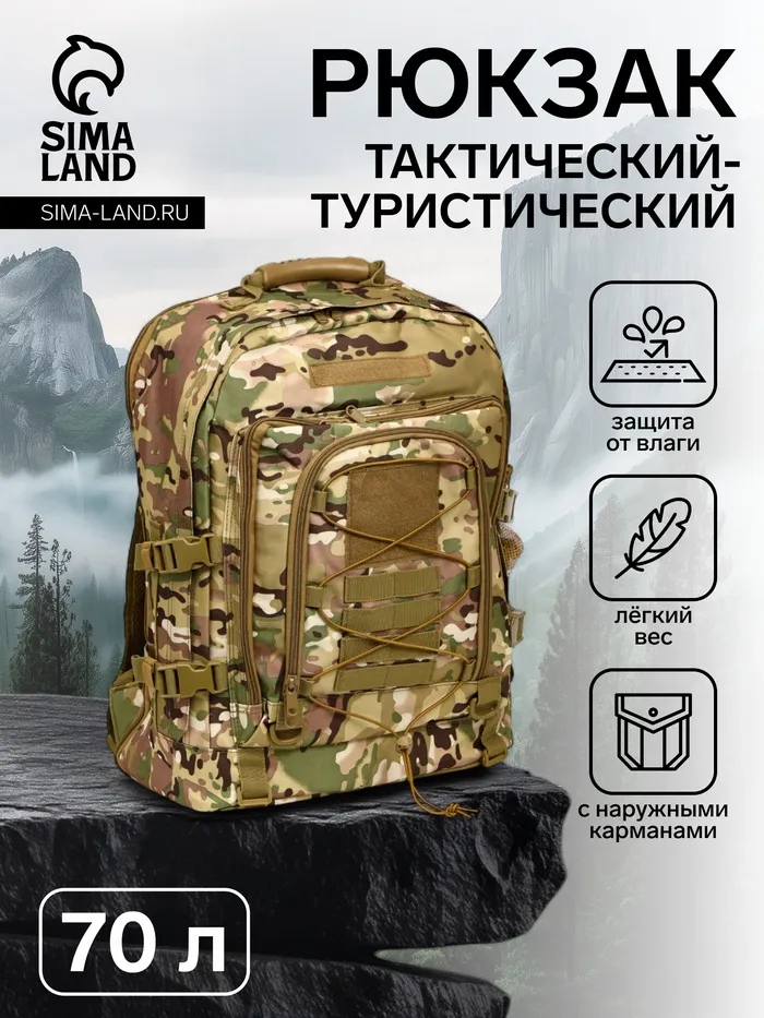 Рюкзак тактический туристический Adventure, 70 л, с карманами, расцветка мультикам, хаки — Характеристики