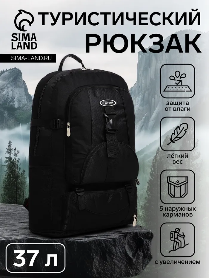 Рюкзак туристический 37 литров, с увеличением, карманами, чёрный — Характеристики