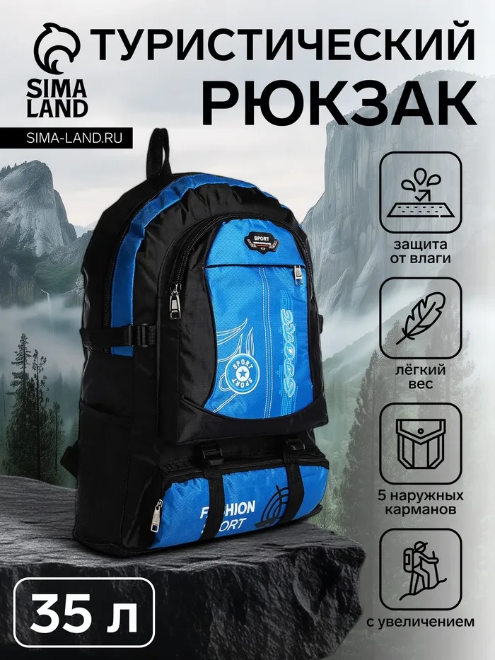 Рюкзак туристический на молнии с увеличением, 35 л, 5 наружных карманов, цвет синий — Характеристики