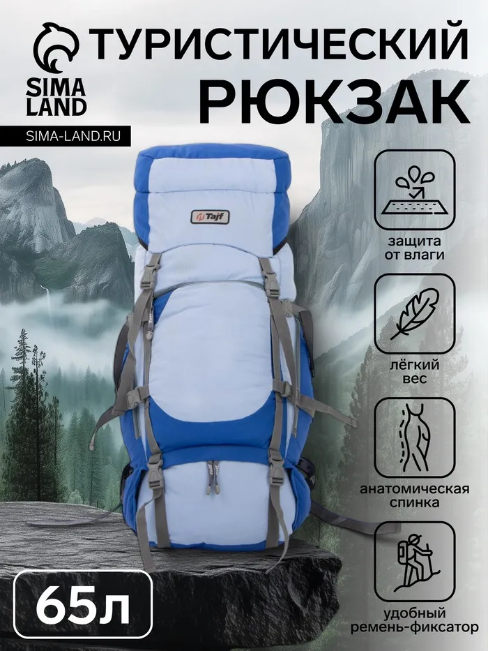 Рюкзак туристический Taif, 65 литров, с поясным ремнём, с карманами, голубой/васильковый — Характеристики