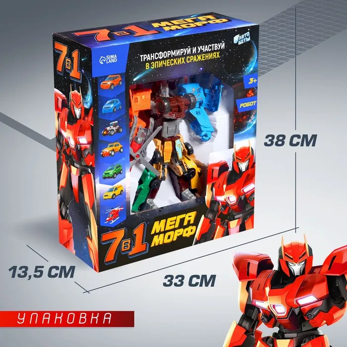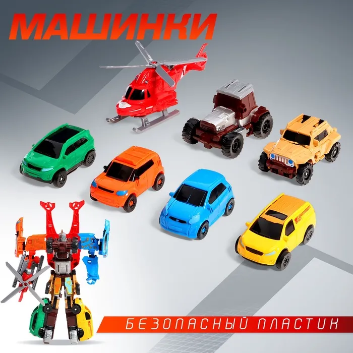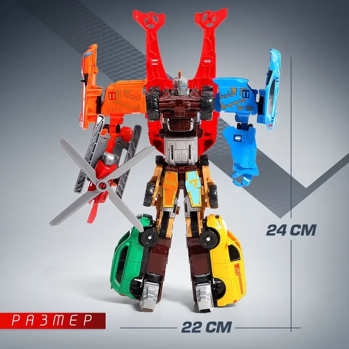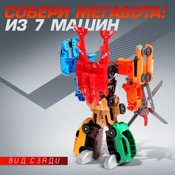 - 7 в 1: 7 роботов-машинок собираются в одного большого робота.