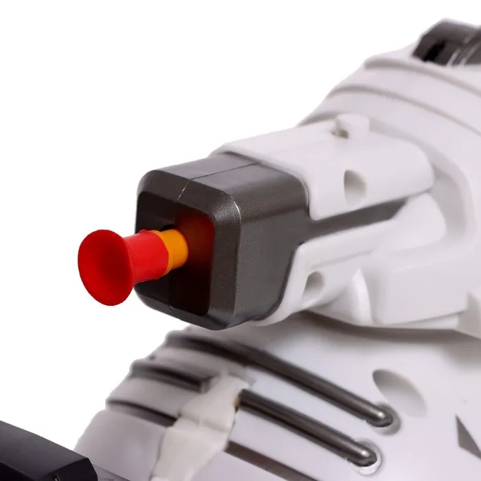 - Стреляет пульками с присоской. Для выстрела нужно вставить пулю в пушку и нажать кнопку на самой пушке.