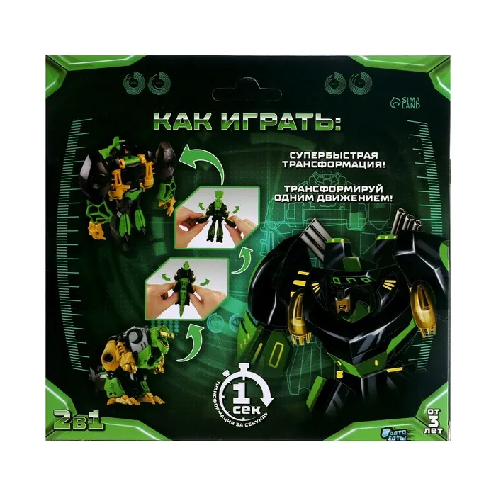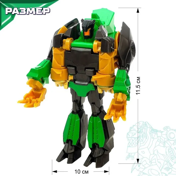 - Мгновенная трансформация — динозавр (9 см) ↔ робот (11,5 см).