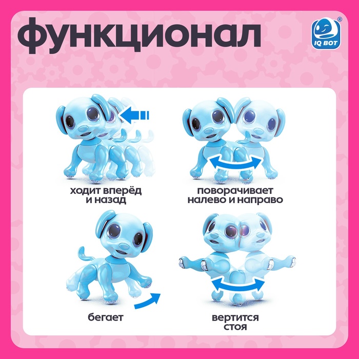 - Робот двигается вперёд и назад, совершает повороты влево и вправо, кружится на задних лапках на 360˚ и делает маленький шаг вперёд.