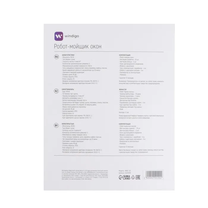 Робот-мойщик окон Windigo WWC-01, 80 Вт, сухая уборка, 4 мин/м2, АКБ, белый — Характеристики