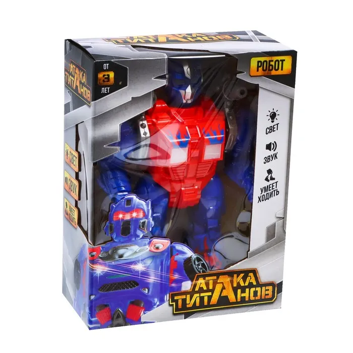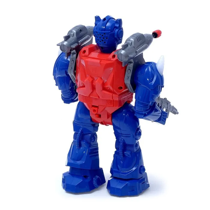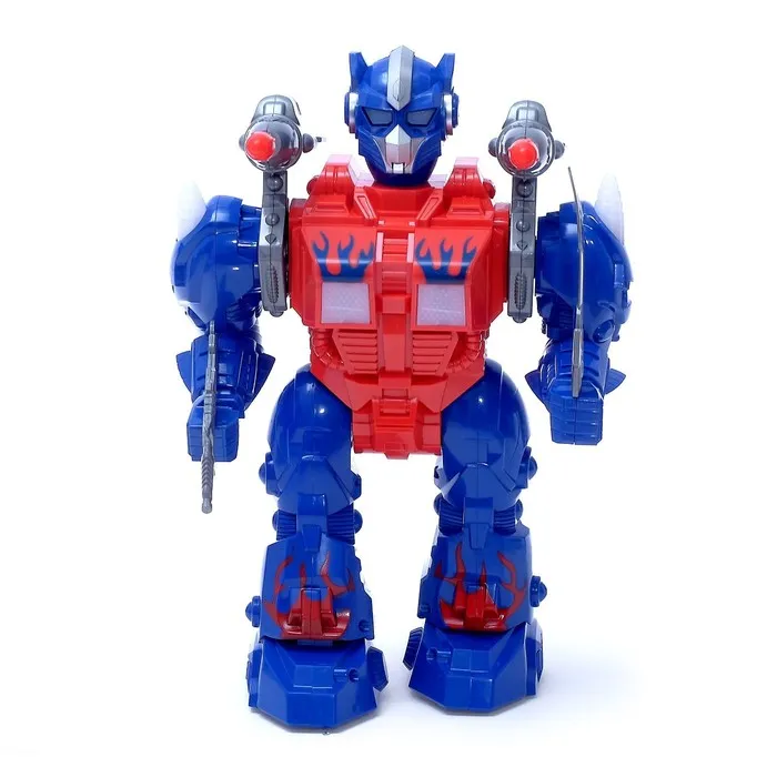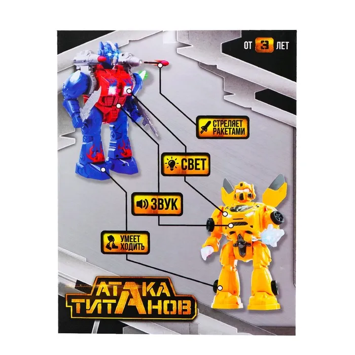 Невероятные возможности робота пробудят фантазию ребёнка и сделают сюжеты разнообразнее и увлекательнее. Вставьте в устройство 2 батарейки типа АА (в комплект не входят), и робот пойдёт вперёд, при этом защитник будет двигать руками, шевелить головой, ярко светить глазами и издавать звуки выстрелов.