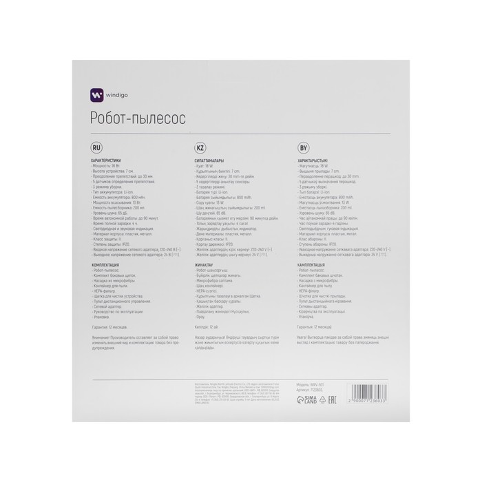 Робот-пылесос Windigo WRV-501, 18 Вт, сухая уборка, 0.2 л, белый — Характеристики